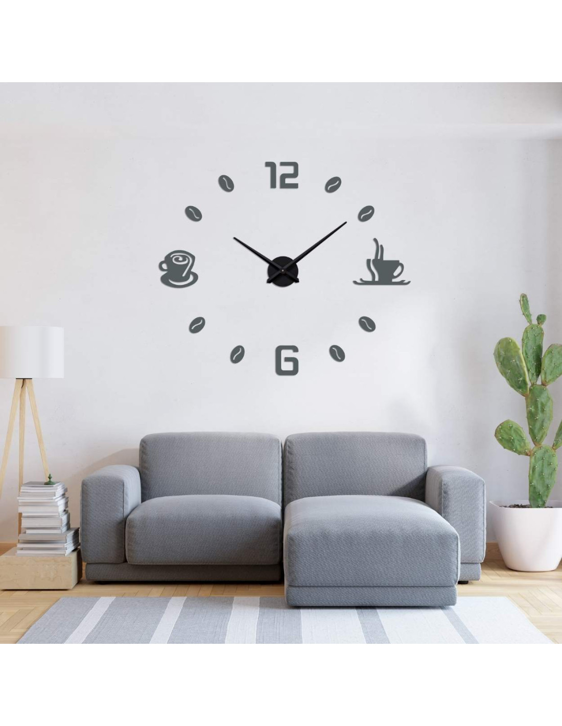 Ceasul negru cu autocolante, cu cești și boabe de cafea minimaliste, nu este doar un accesoriu practic, ci și elegant pentru interior.