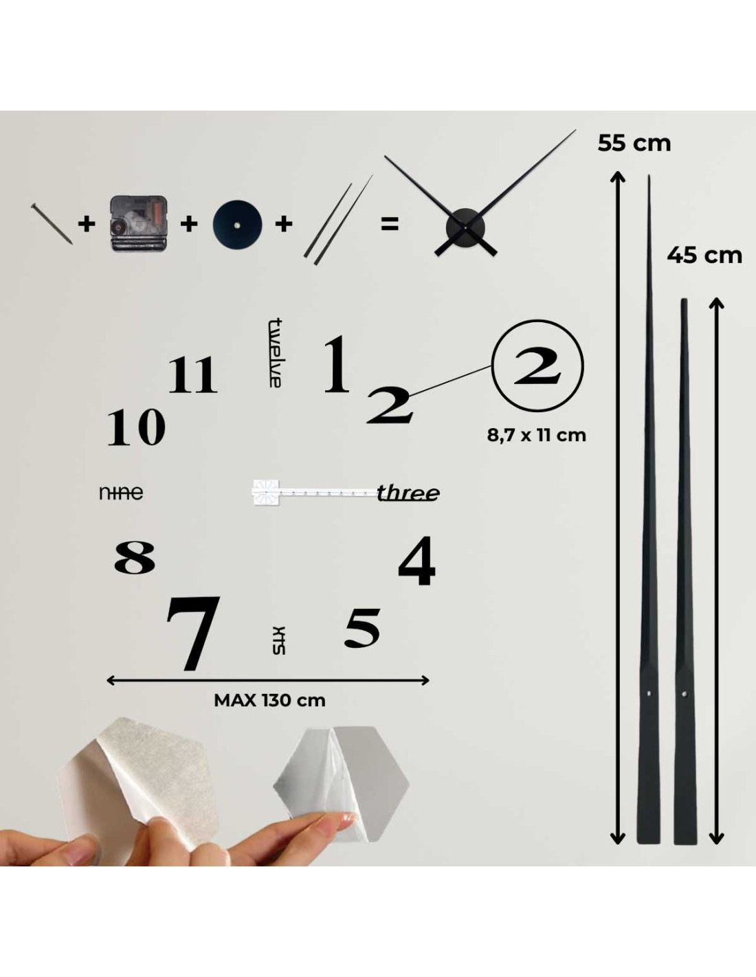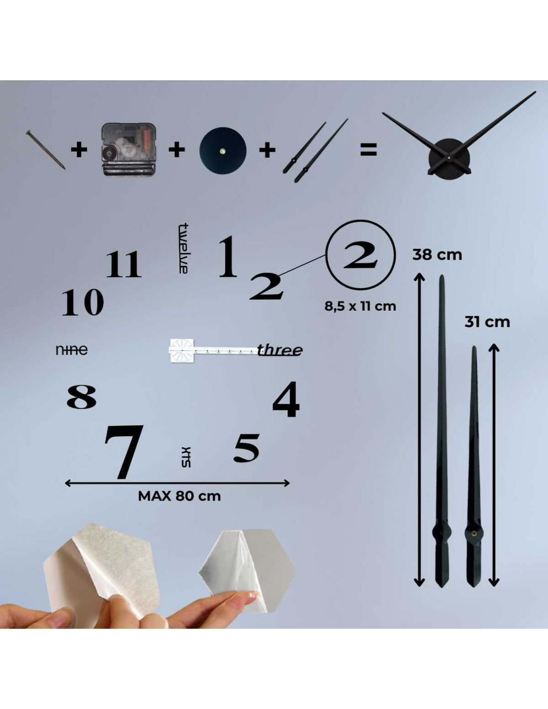 - Numerele cadranului au un strat autoadeziv, astfel încât instalarea este rapidă și fără găurire.