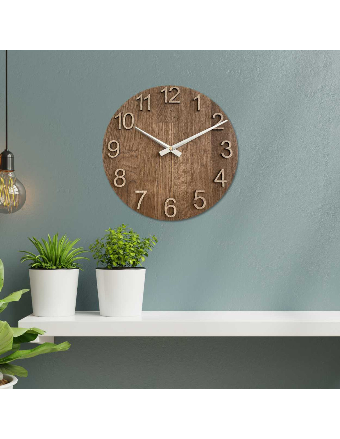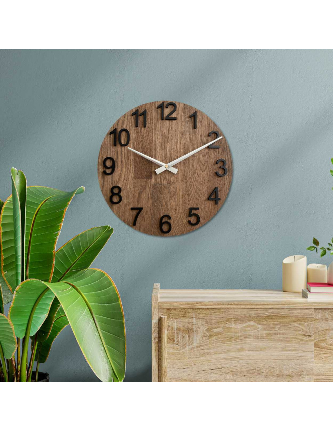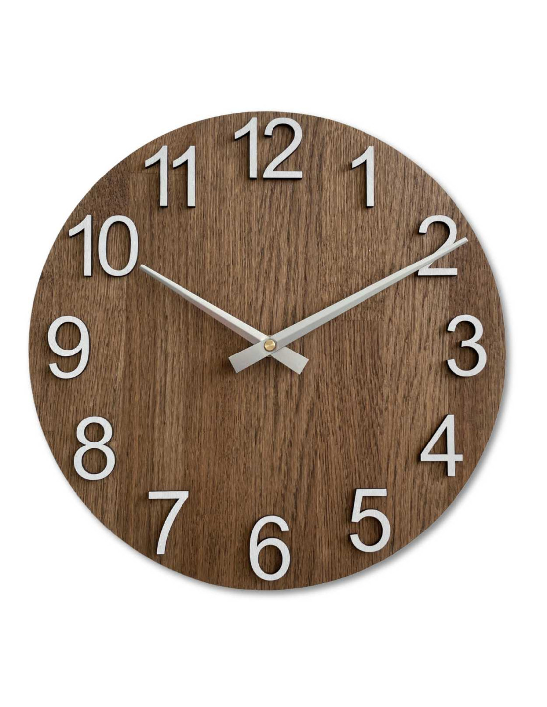 Ceas de perete rotund cu suprafață din lemn și marcaje orare delicate