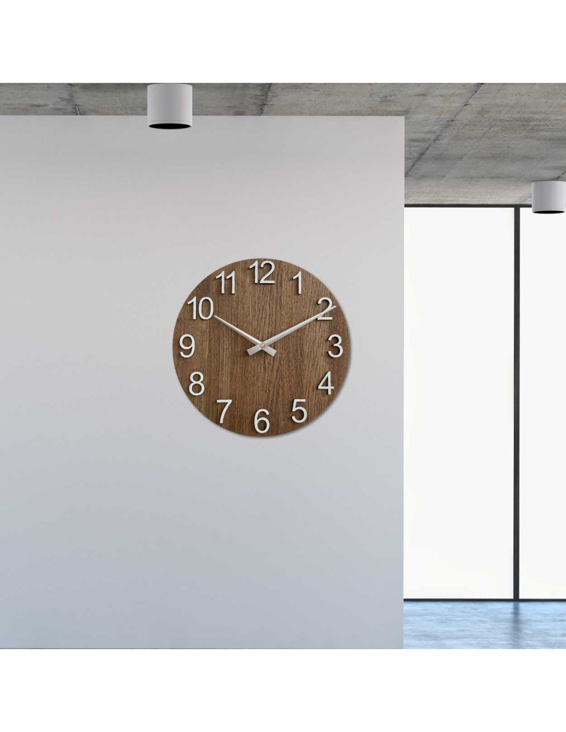 Ceas de perete din lemn, cu formă rotundă și ace argintii