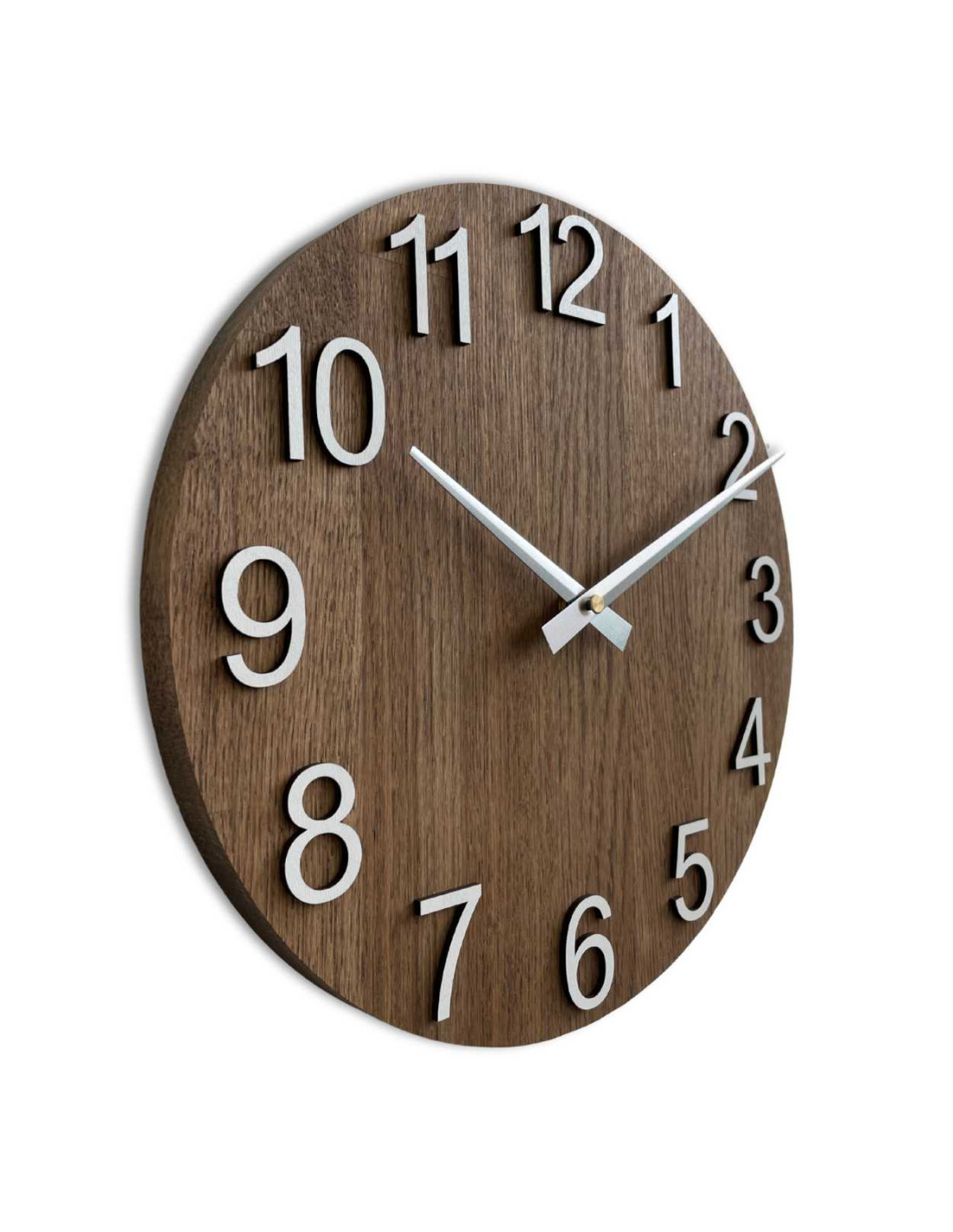 Ceas modern din lemn, cu formă rotundă și cadran discret