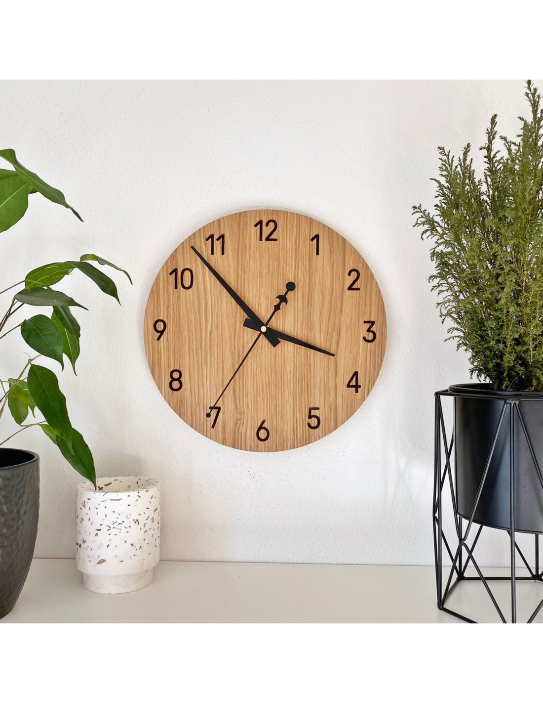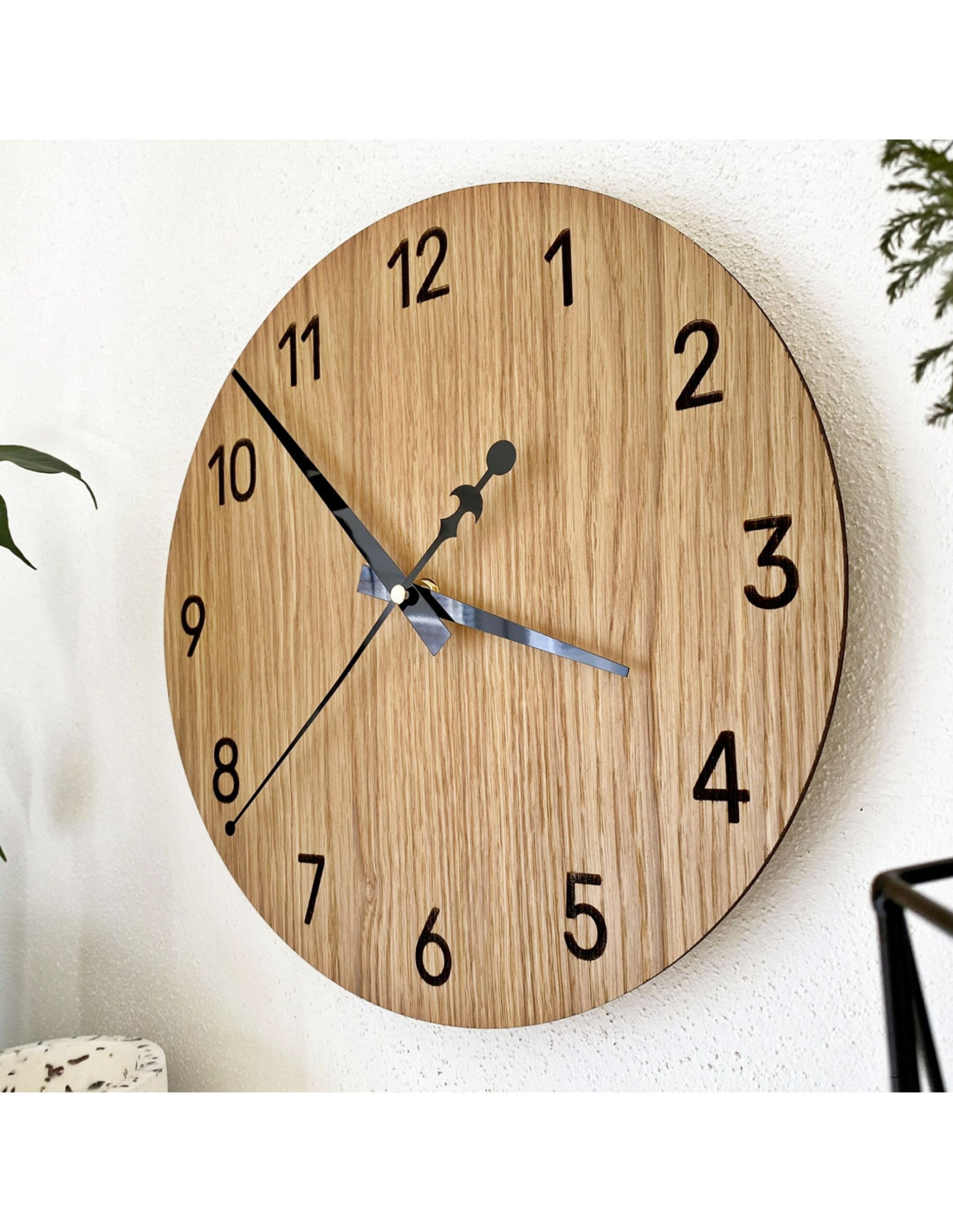 Frumusețea naturală a lemnului de stejar, combinată cu acele negre elegante, creează un aspect subtil și modern. Ceasul se îmbină perfect atât cu interioarele rustice, cât și cu cele minimaliste și aduce un element vizual armonios spațiului.