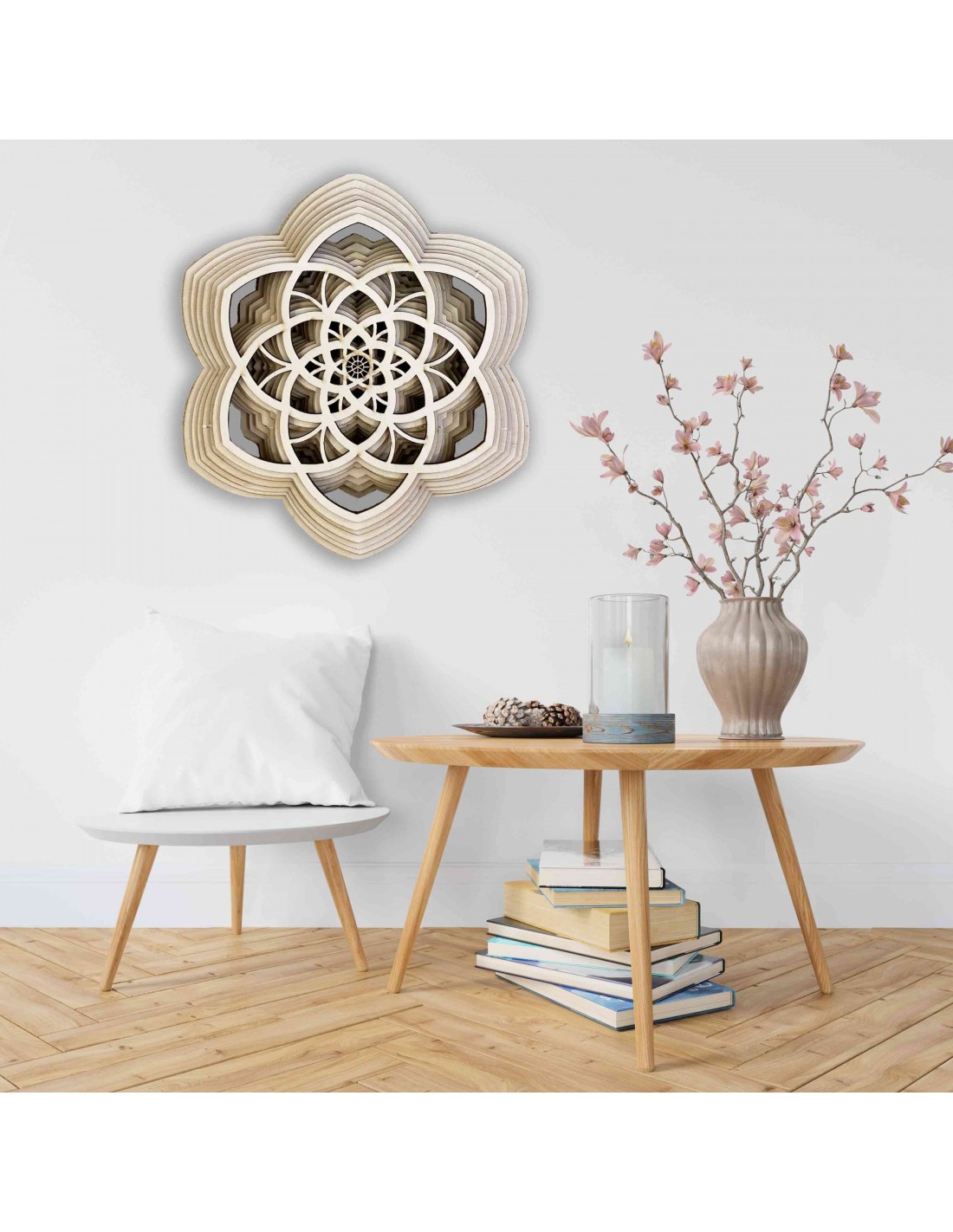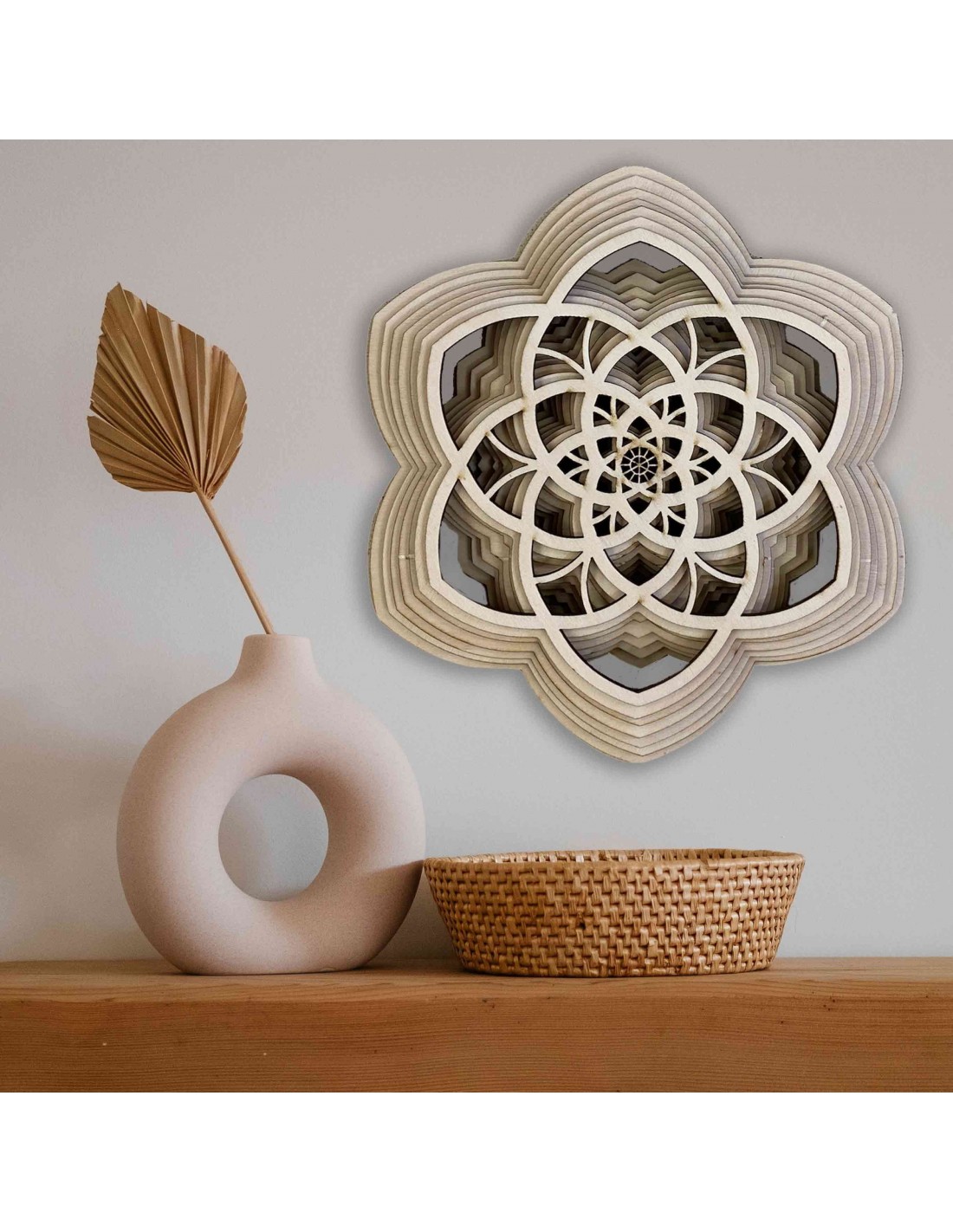 Mandala 3D din lemn este creată din mai multe straturi tăiate cu laser.