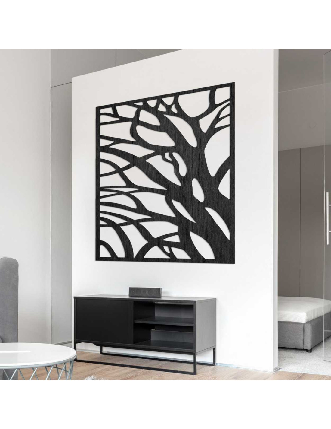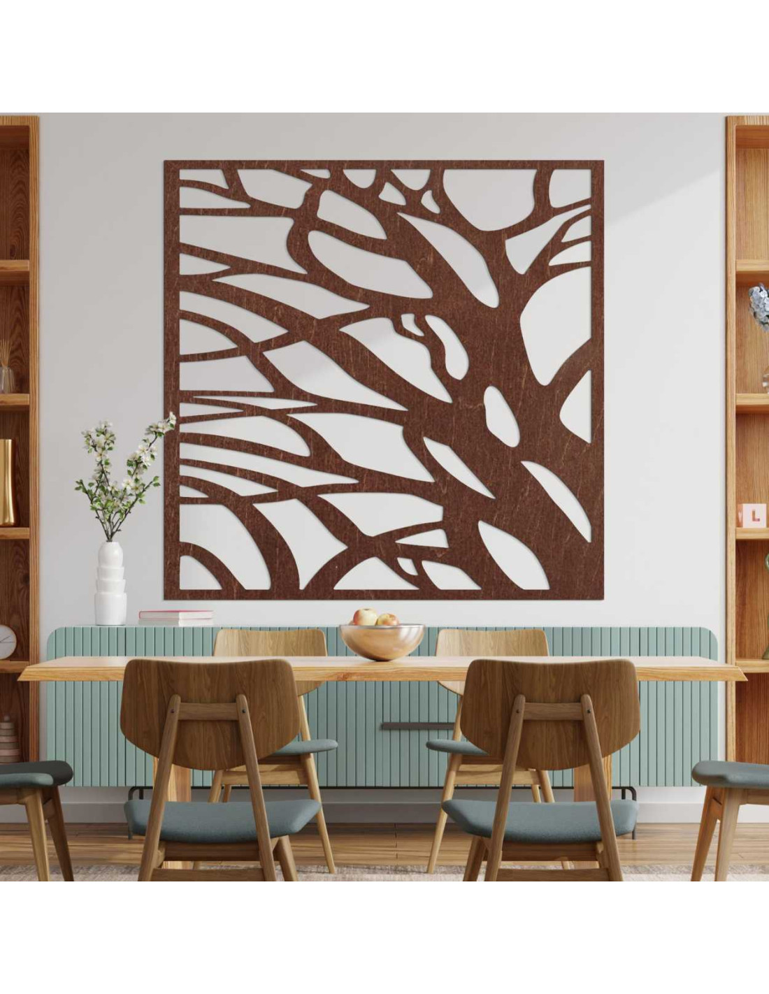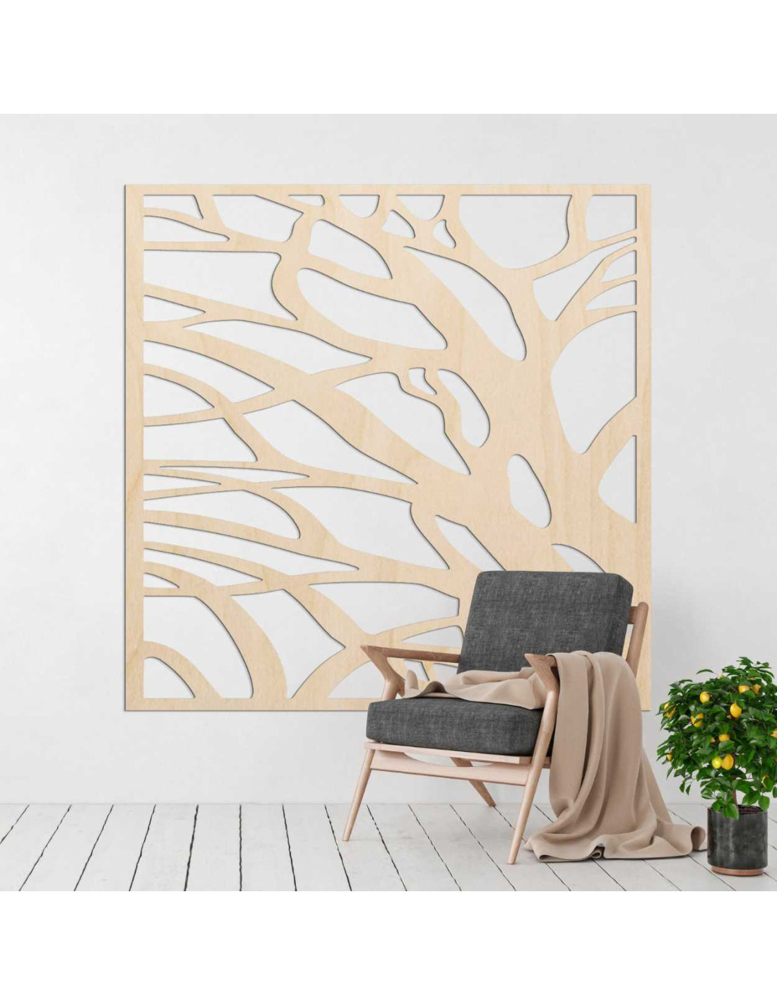 SentopImaginea din lemn a unui copac cu ramuri ca decor de perete combină designul natural, un decupaj aerisit și un element interior modern.