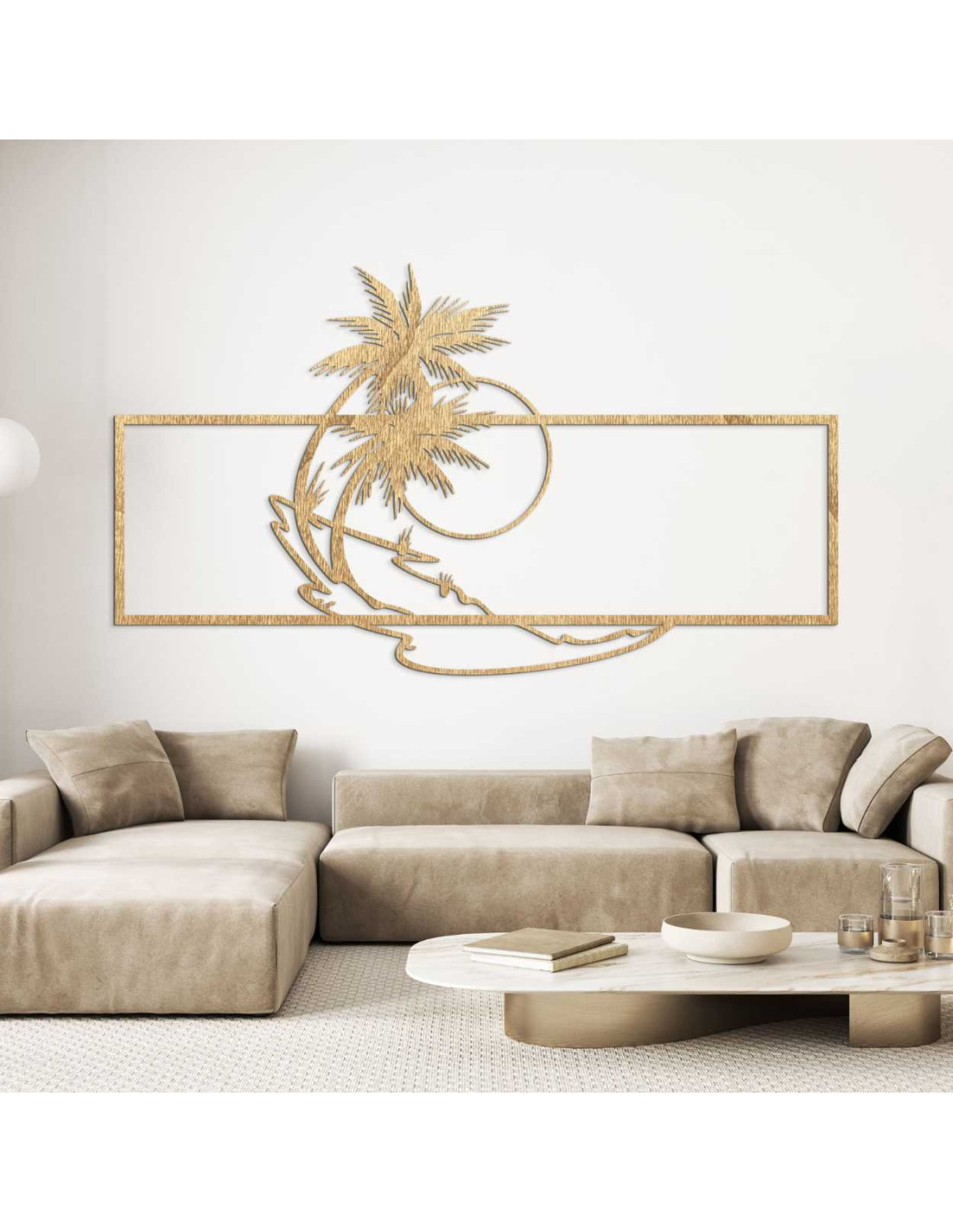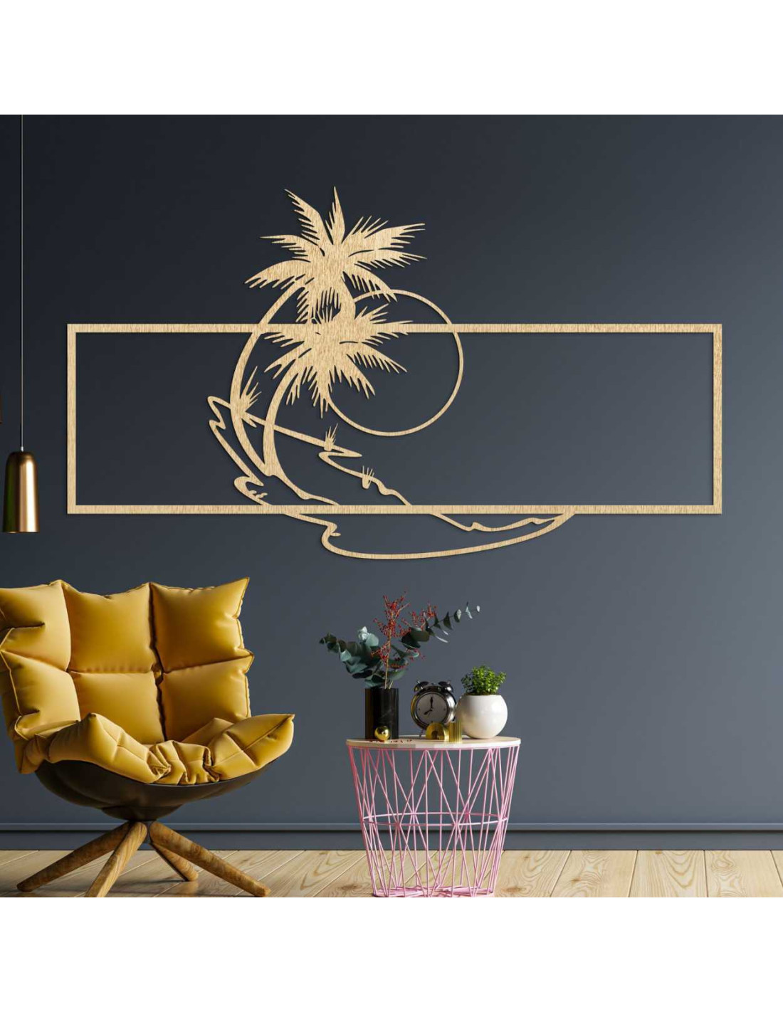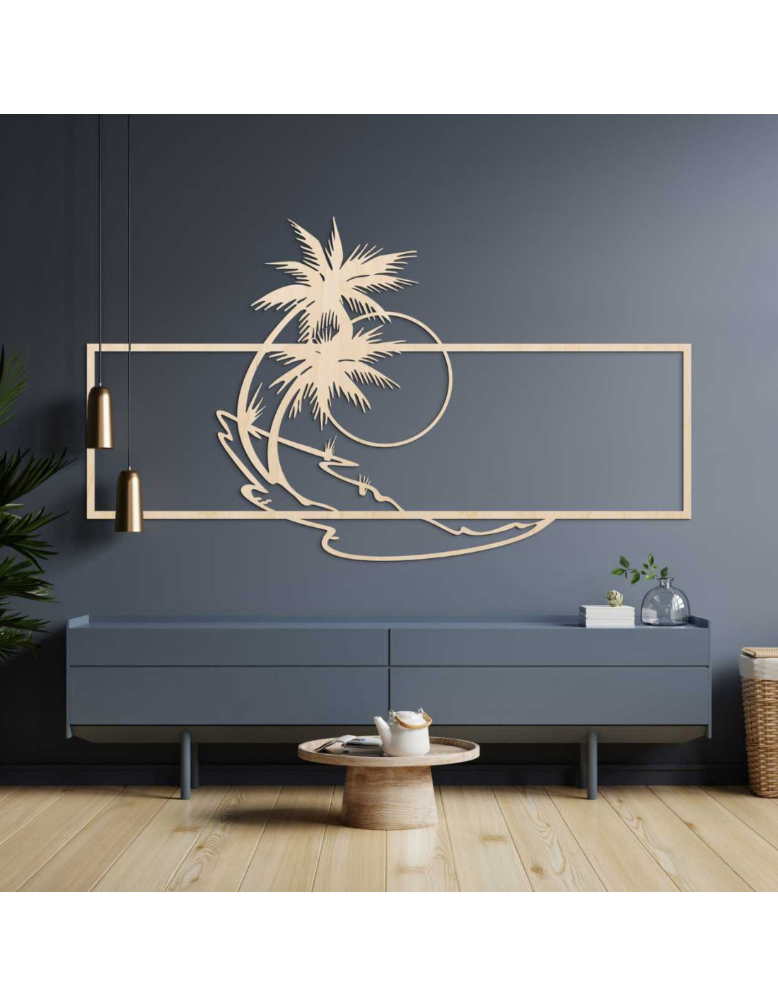 Decorațiune de perete din lemn natural cu motiv de palmier și plajă