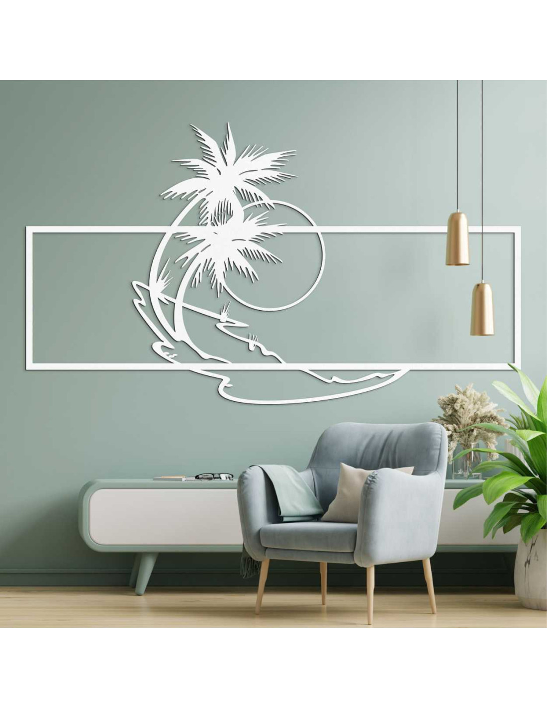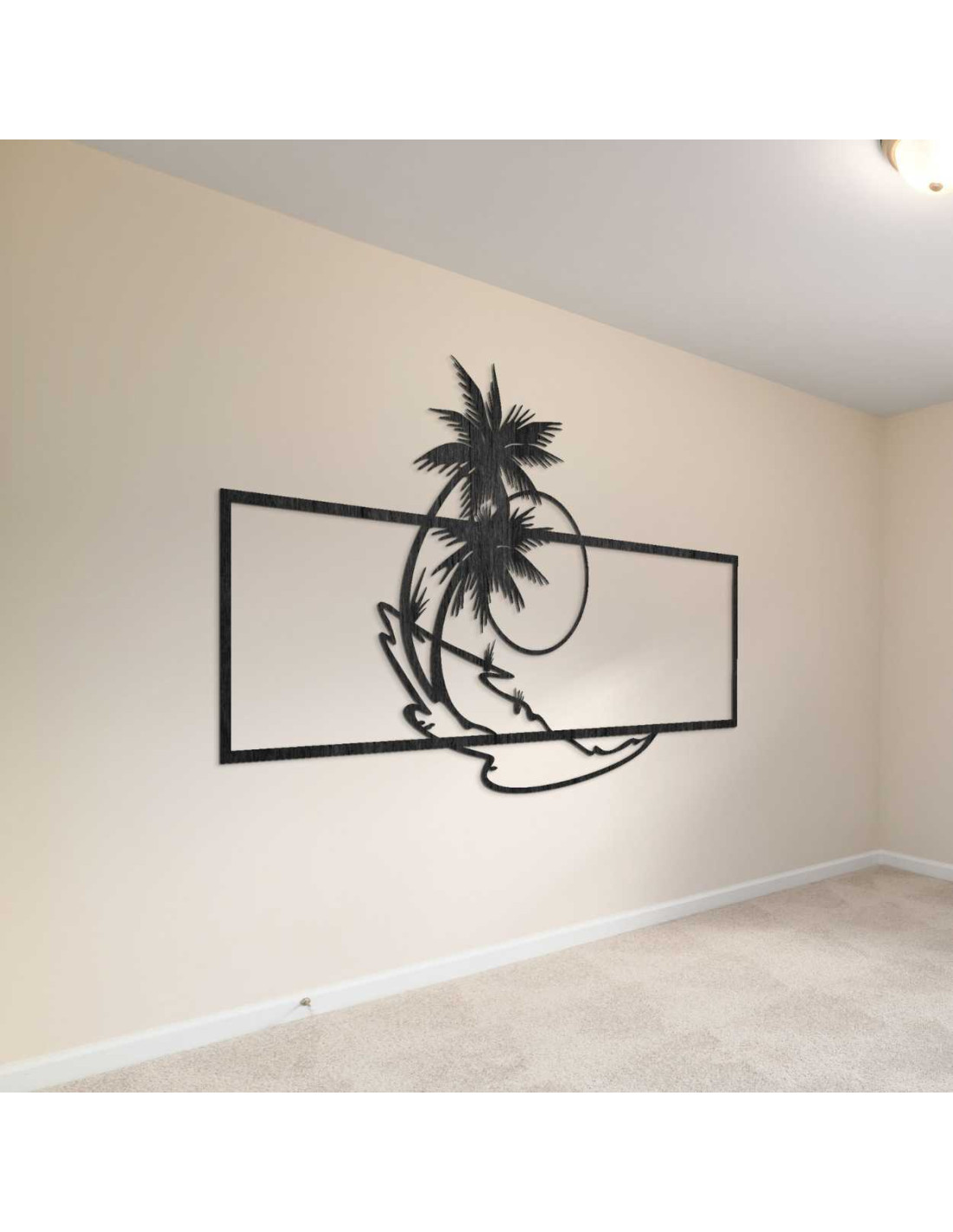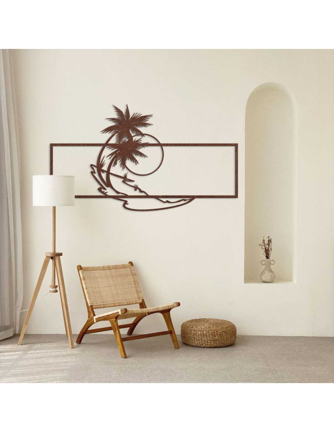 Decorațiune de perete din lemn natural cu motiv de palmier și plajă
