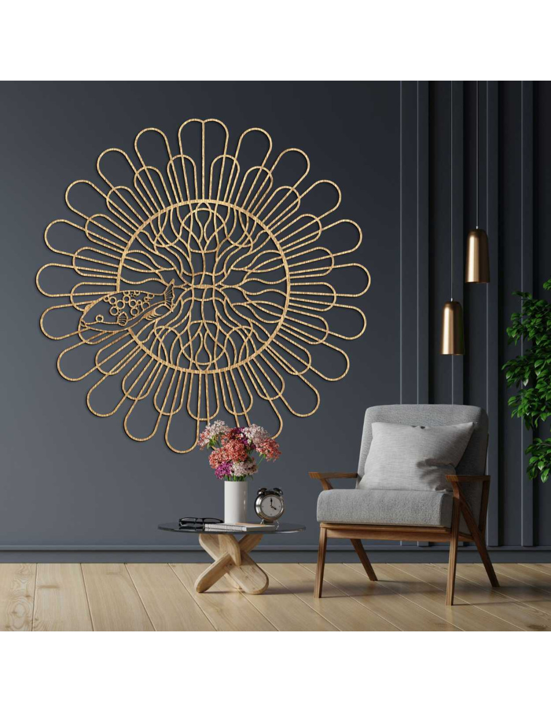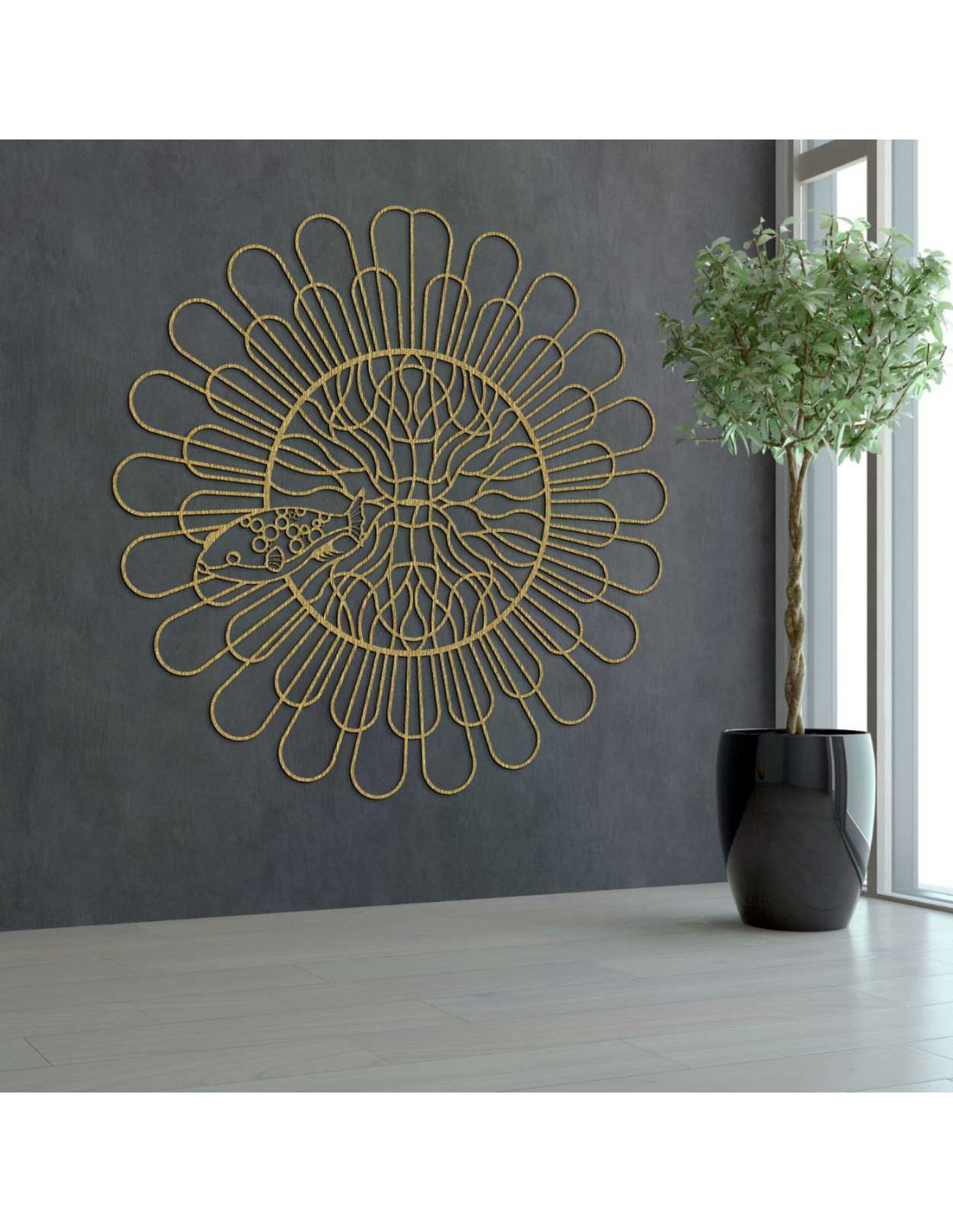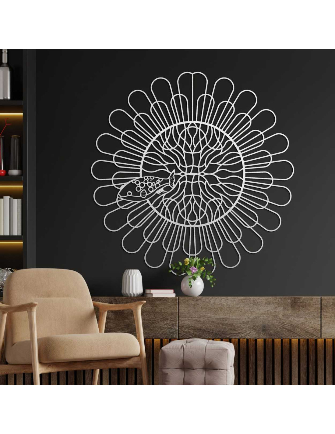 Liniile uniform distanțate creează iluzia mișcării și structurii. Un motiv de pește fin sculptat, cu detalii contrastante , este încorporat în spațiul central. Forma organică perturbă precizia tehnică a cercului, creând contrast. Întregul design acționează ca o expresie vizuală a echilibrului dintre ordine și întâmplare.