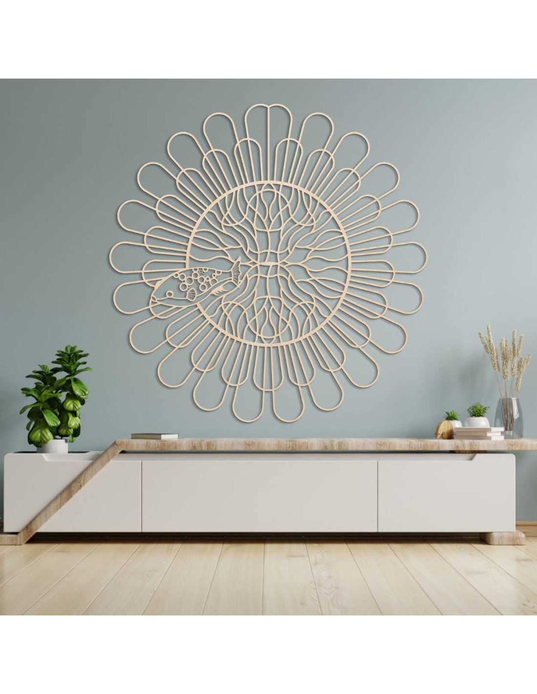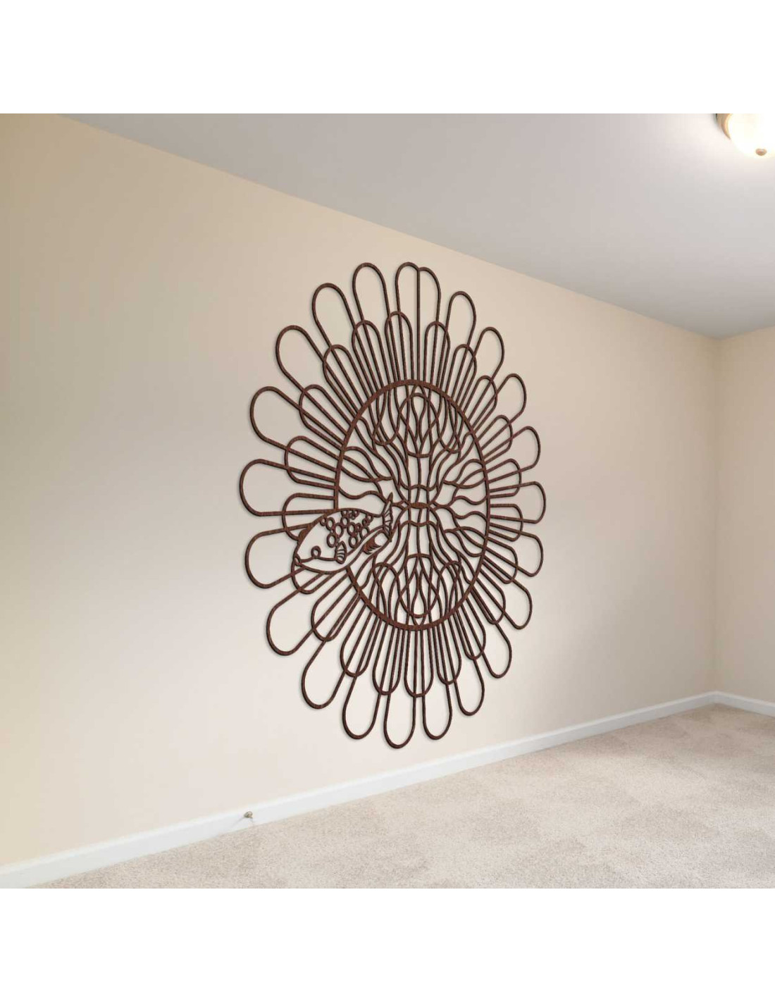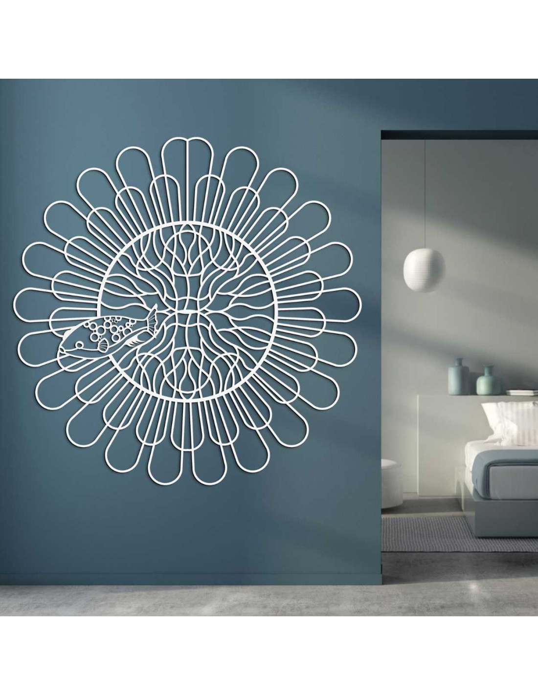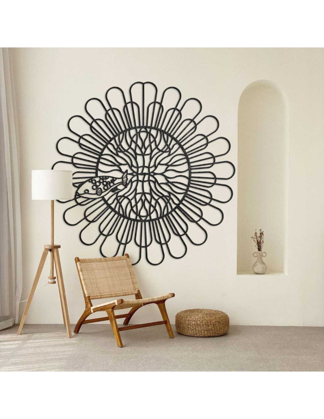 Liniile uniform distanțate creează iluzia mișcării și structurii. Un motiv de pește fin sculptat, cu detalii contrastante , este încorporat în spațiul central. Forma organică perturbă precizia tehnică a cercului, creând contrast. Întregul design acționează ca o expresie vizuală a echilibrului dintre ordine și întâmplare.
