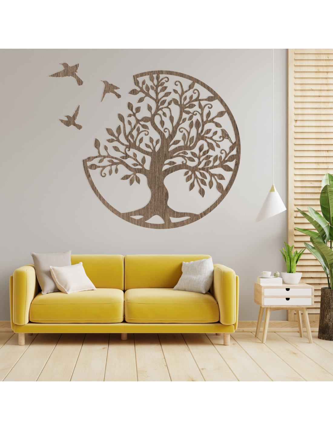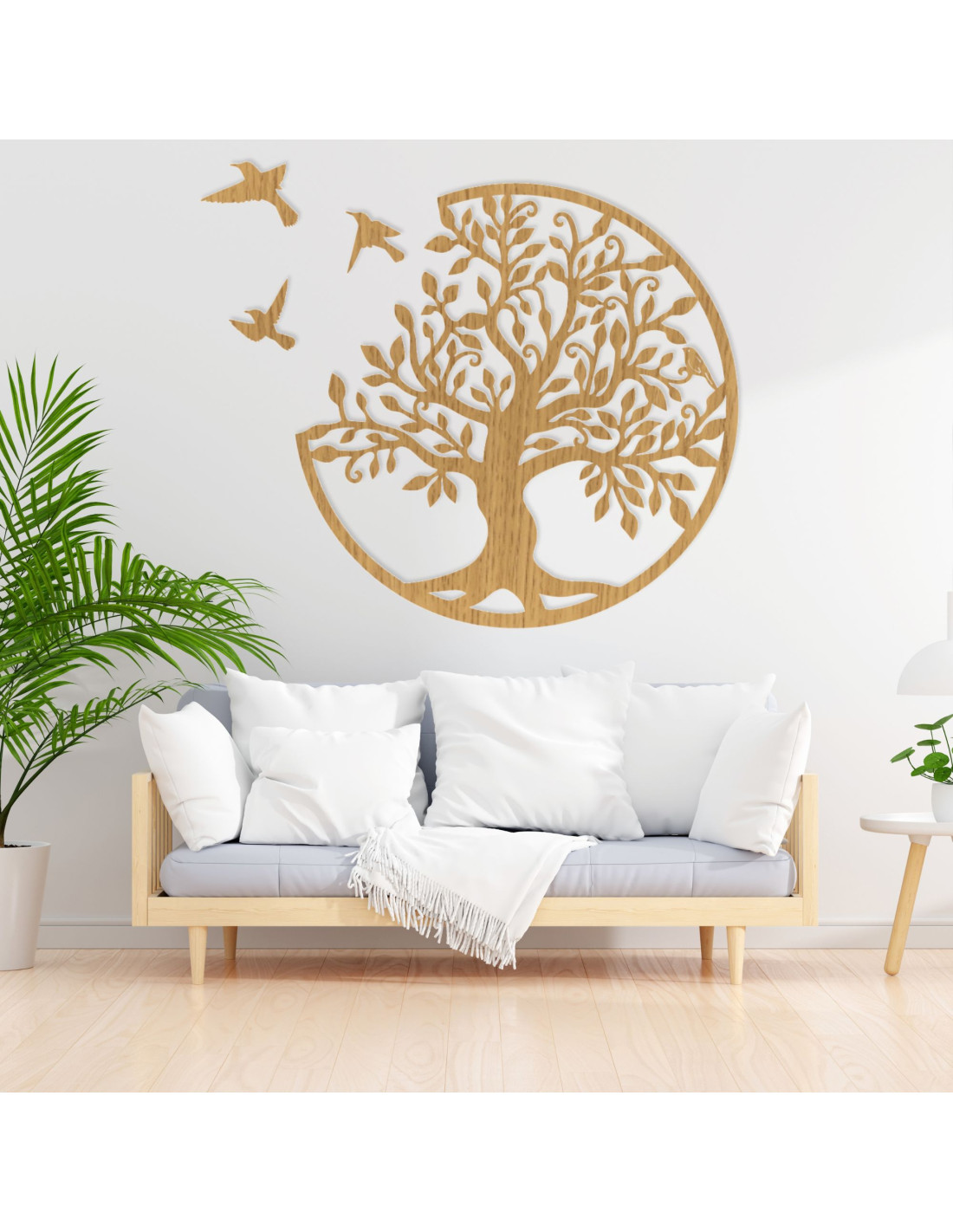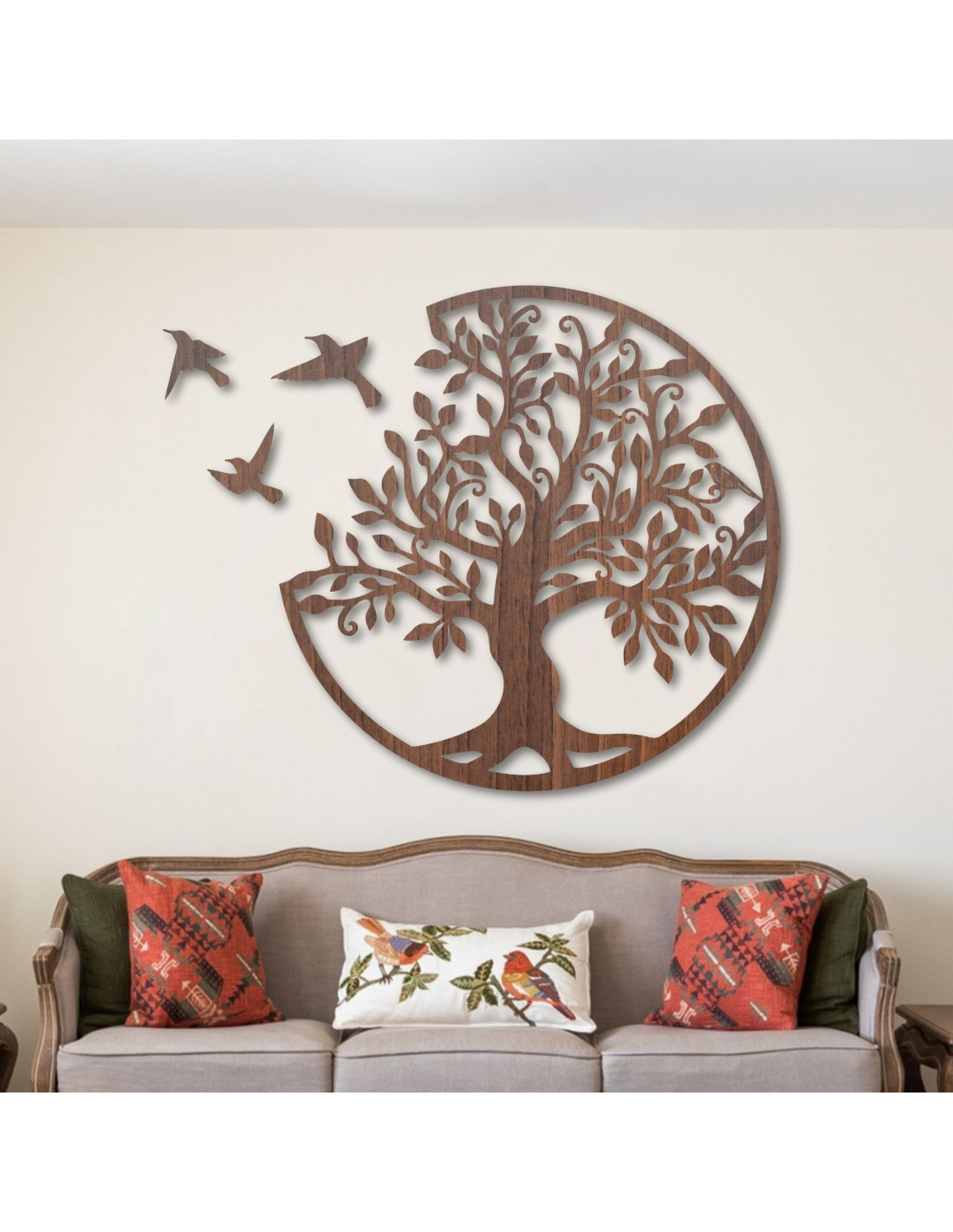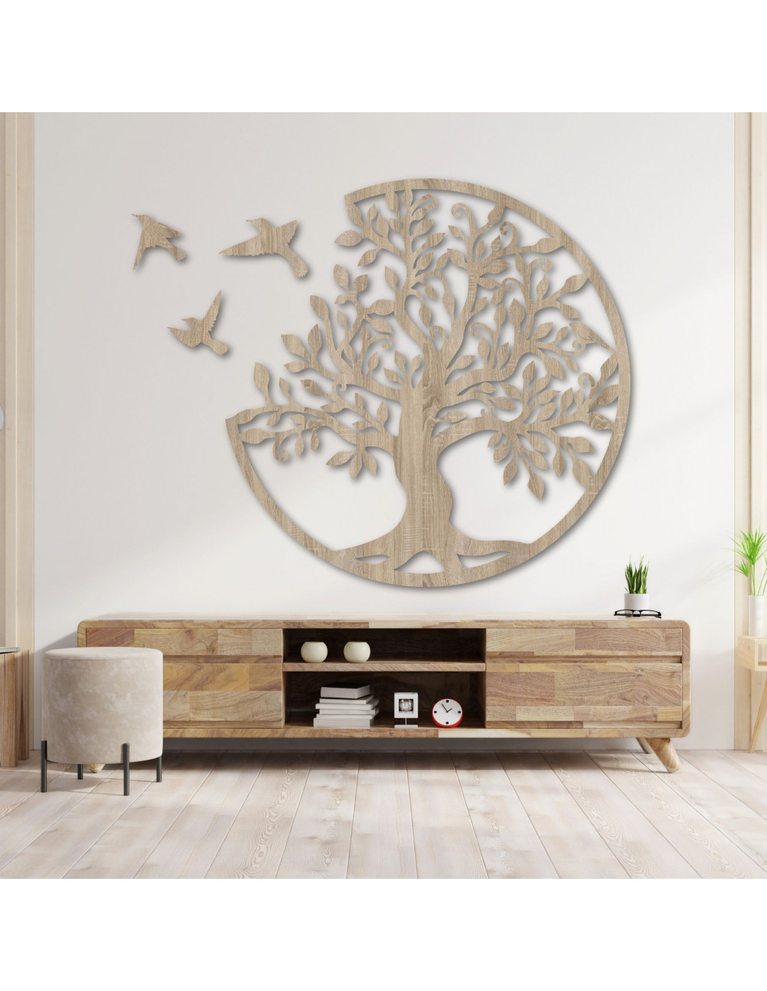 Decorațiune elegantă de perete din lemn, în formă de pom al vieții cu păsări, care aduce armonie și frumusețe naturală casei tale. Această imagine unică din placaj este sculptată folosind tehnologie laser precisă și apoi finisată manual pentru un aspect perfect și un finisaj de înaltă calitate.