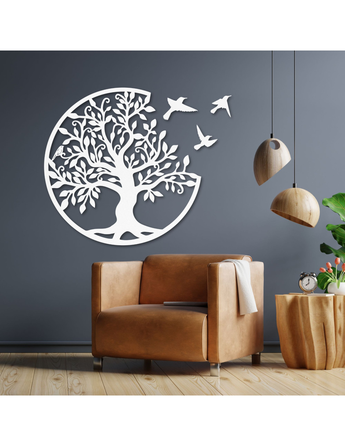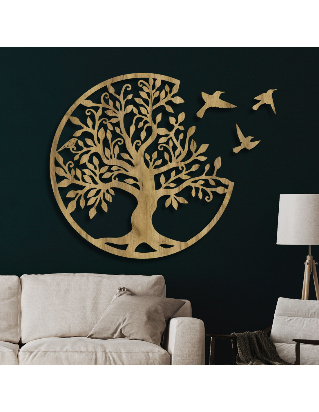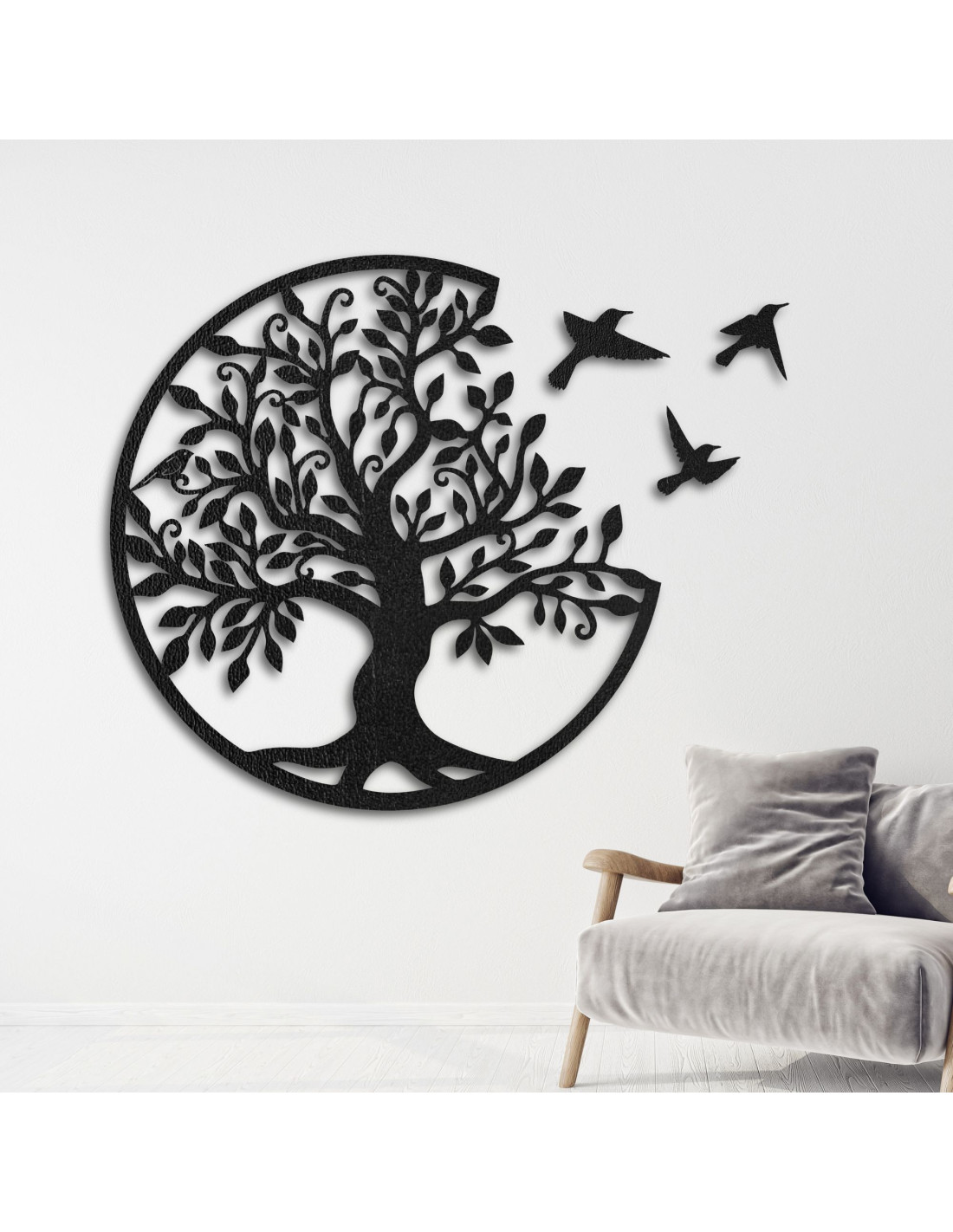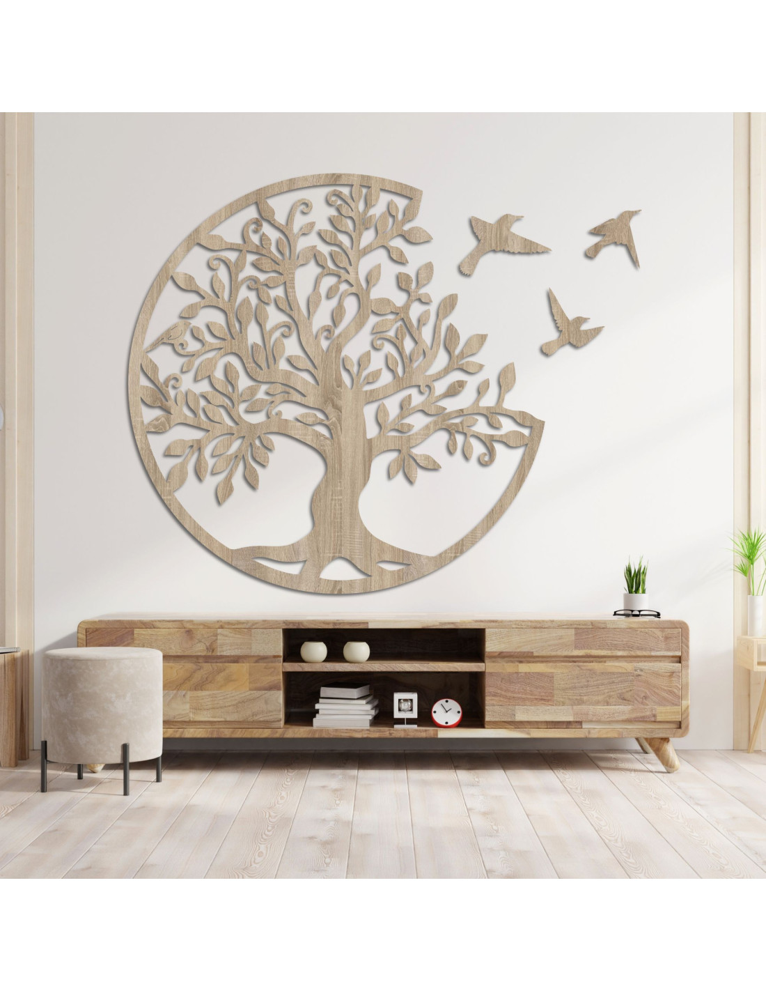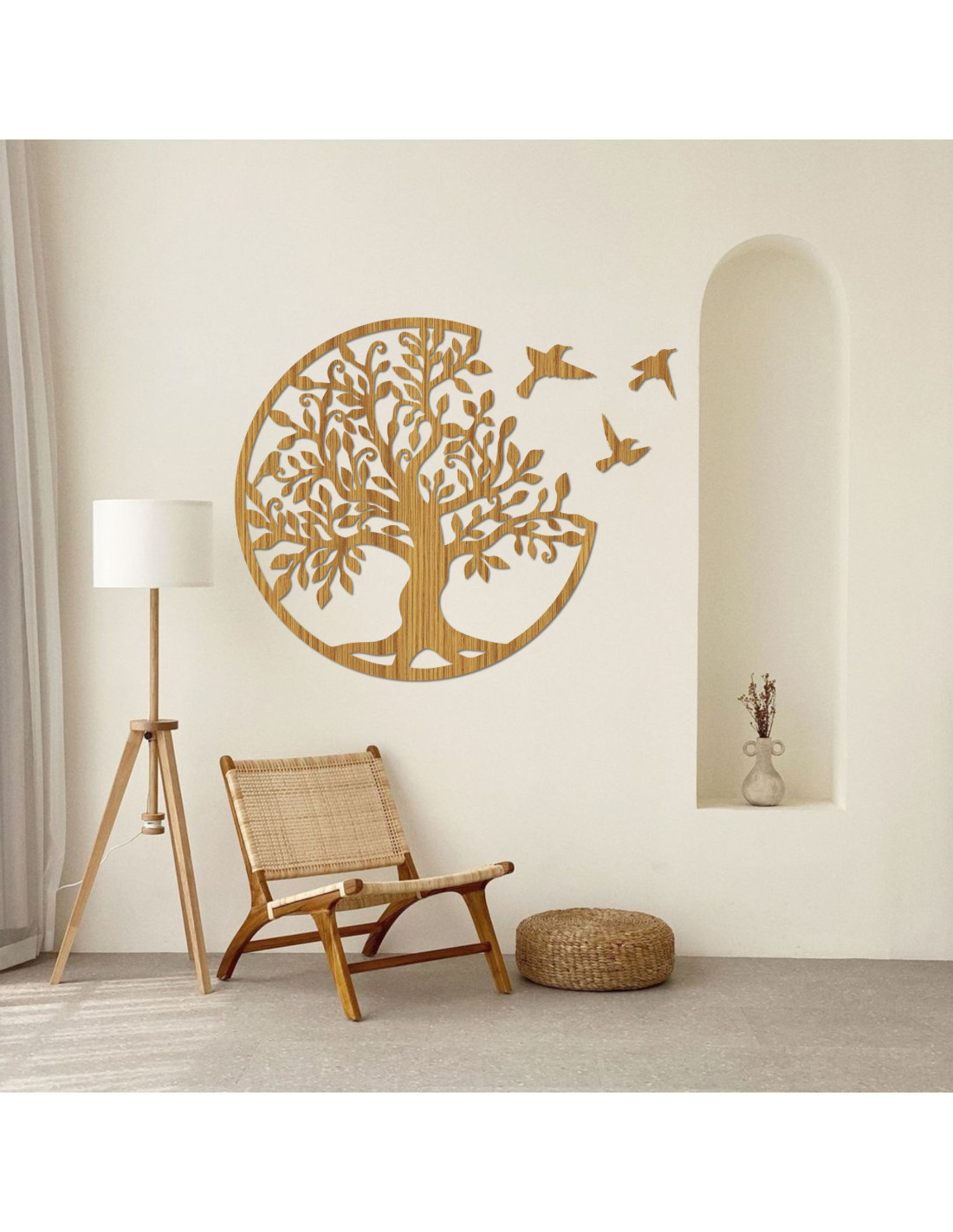 Pictura pe lemn - Copacul Vieții cu 3 păsări în zbor este o pictură murală elegantă.