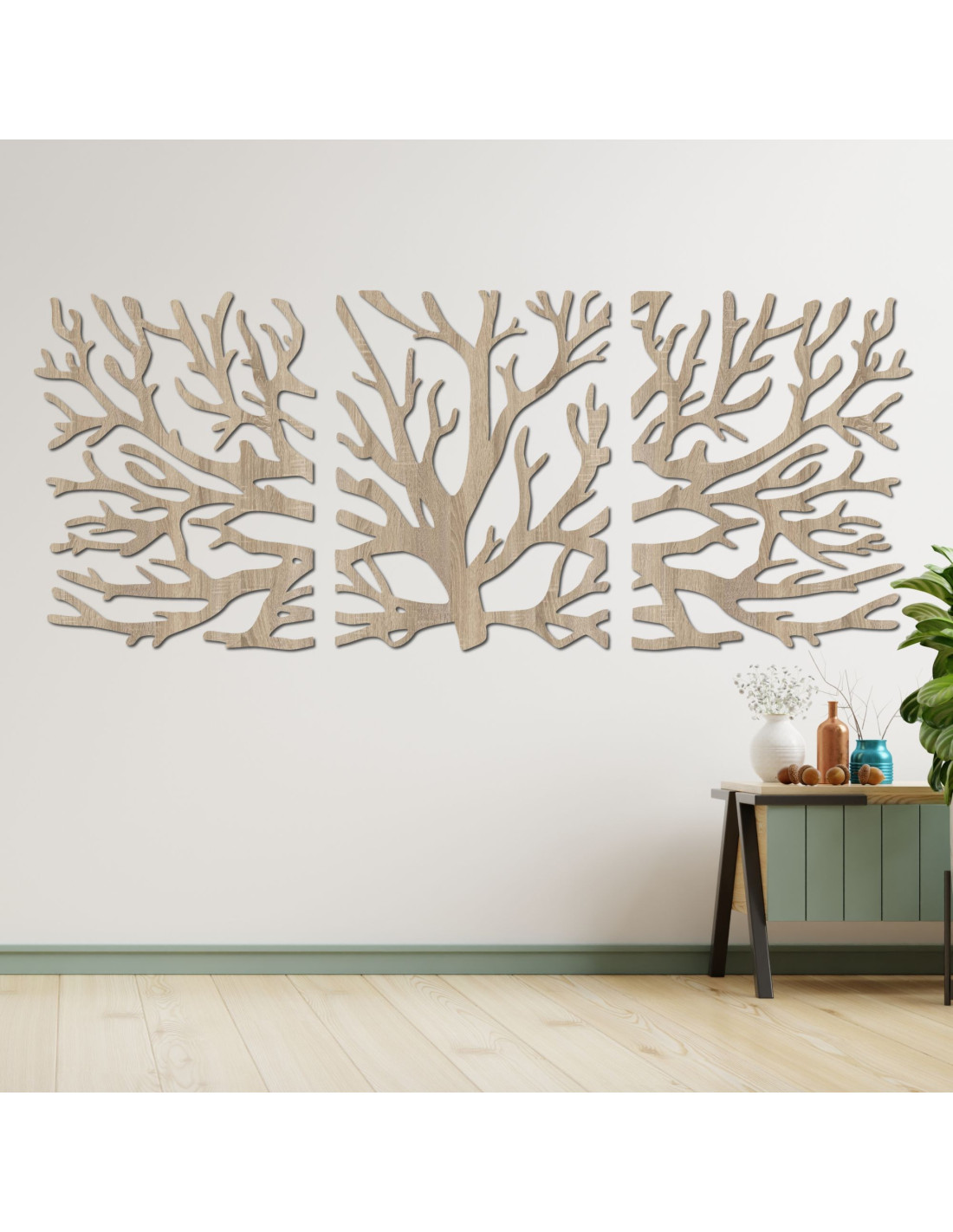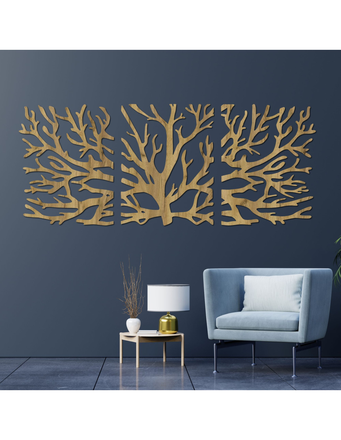 Descoperiți tabloul nostru din trei piese cu copaci și crengi , combinația perfectă de design modern și eleganță pentru interiorul dumneavoastră. Această operă de artă unică , finisată într-o culoare închisă atemporală, va aduce prospețime și armonie în camera de zi, birou sau sufragerie. Crengile care se întind sunt ideale pentru a fi expuse deasupra unei canapele sau ca parte a unei galerii de artă. Nu numai că vă vor înviora peretele, dar vor crea și o atmosferă de pace care promovează sentimente pozitive. Adăugați acest tablou original în casa dumneavoastră și lăsați-l să spună o poveste unică ce reflectă personalitatea și stilul dumneavoastră. Faceți un pas către un stil de viață modern și elegant.