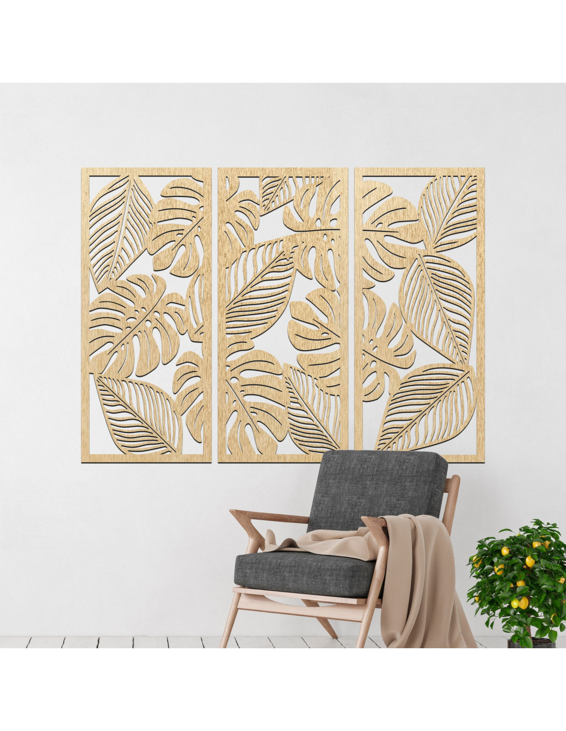 Descoperiți frumusețea naturii cu pictura noastră monstera din lemn, formată din trei piese. Această operă de artă, realizată cu măiestrie unică, este o completare excelentă pentru orice interior , de la stilul modern la cel clasic. Designul său detaliat și texturile bogate ale lemnului creează un contrast frumos și adaugă profunzime spațiului.