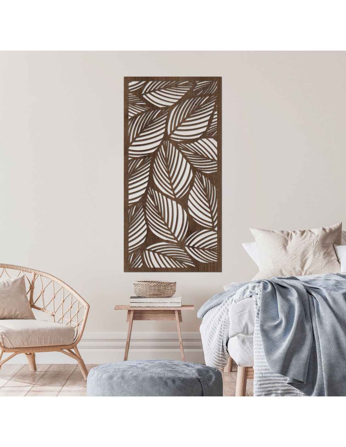 Decorul din lemn cu motiv de frunze simbolizează creșterea, pacea și legătura cu natura. Lemnul va ieși frumos în evidență pe perete și va completa atât interioarele moderne, cât și cele boho. Combinați-o cu mobilier sau plante din lemn pentru un efect perfect.