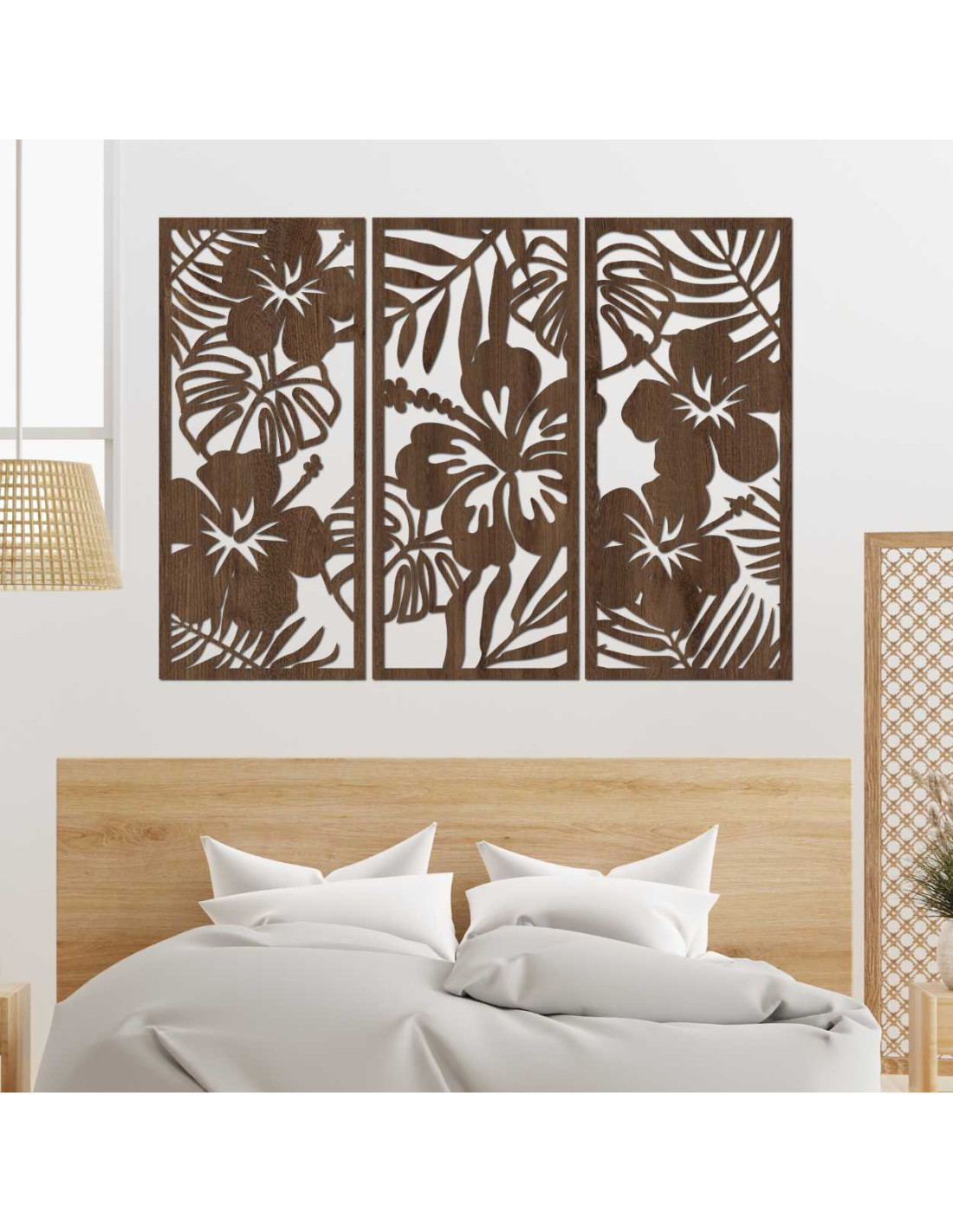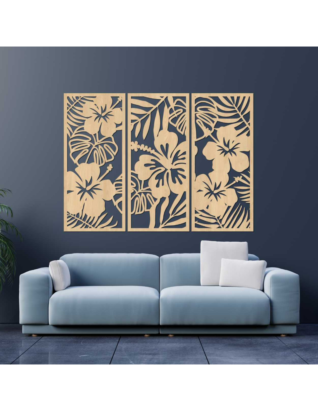 Pictura elegantă în trei părți cu flori exotice aduce o notă de confort tropical spațiului.