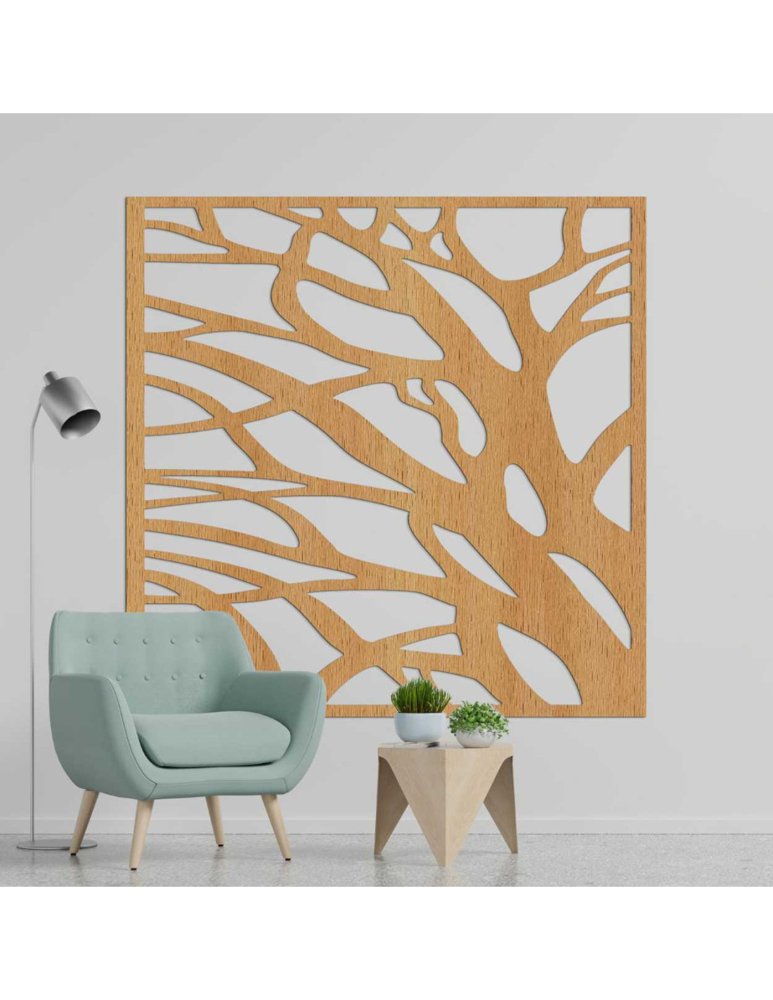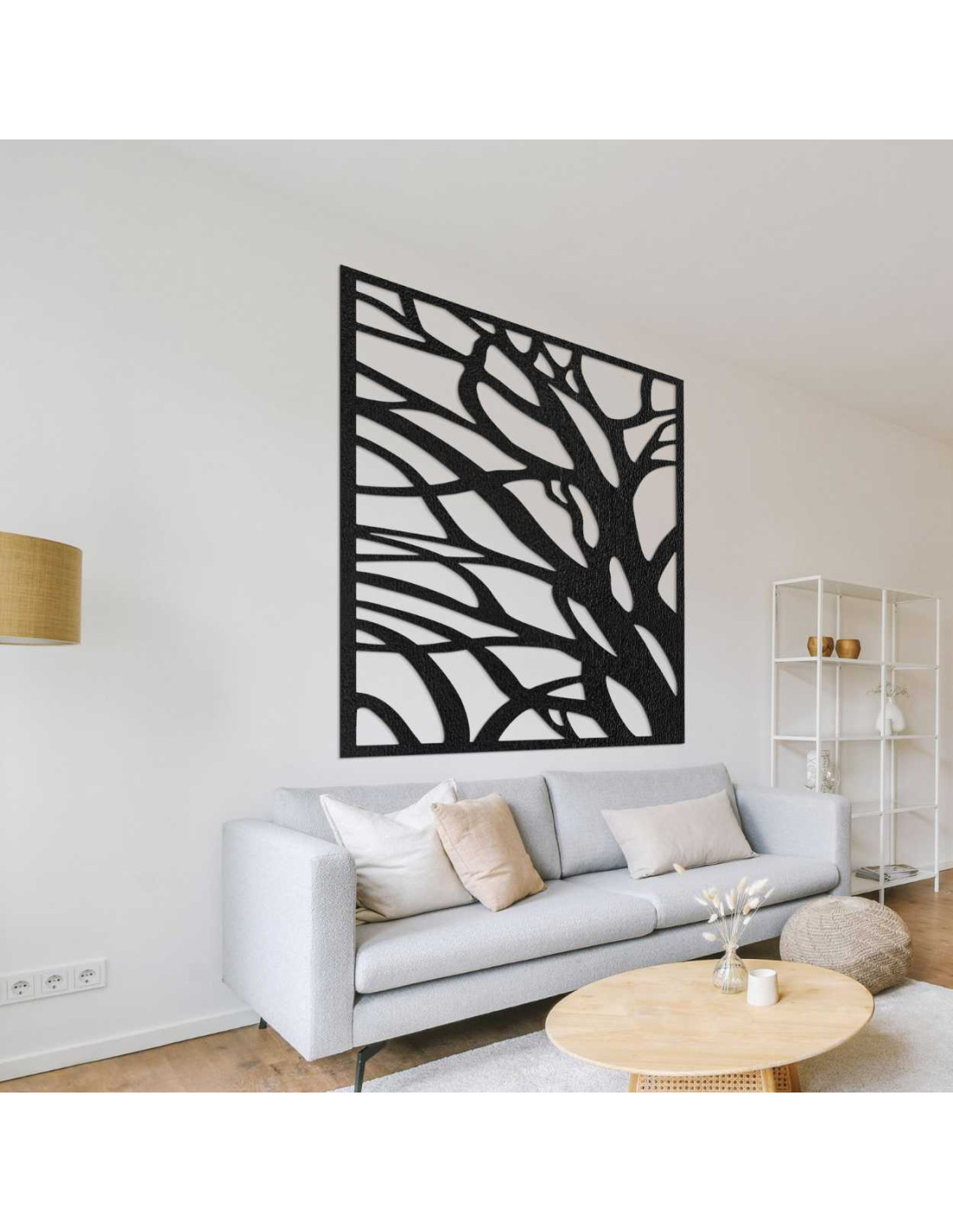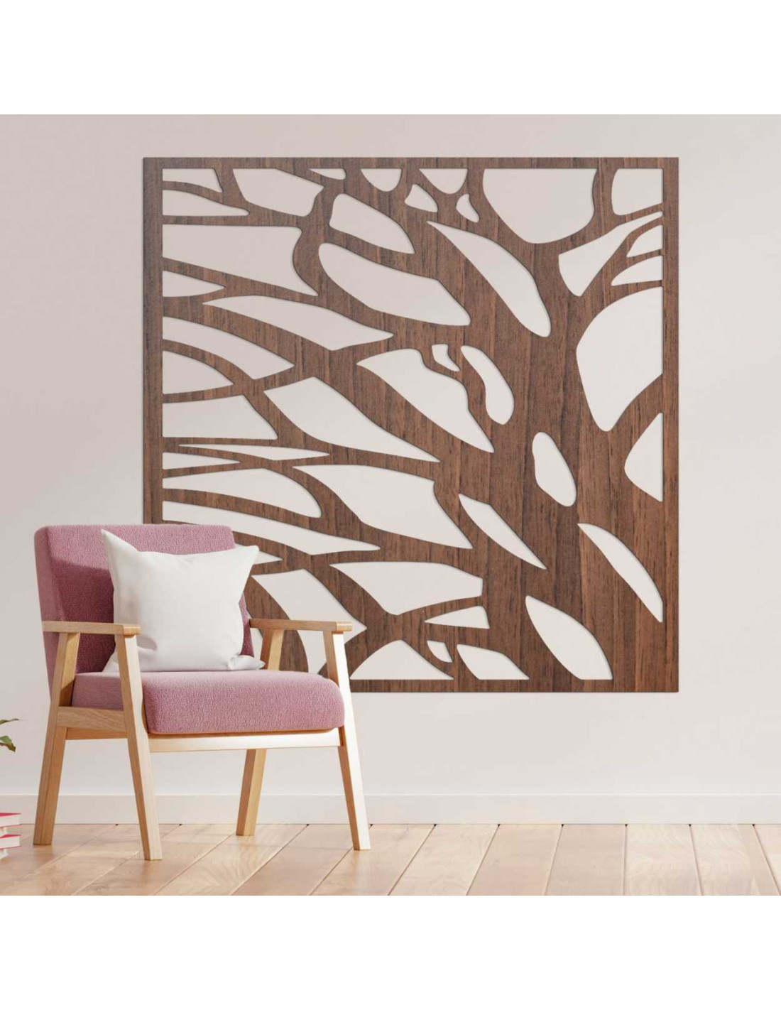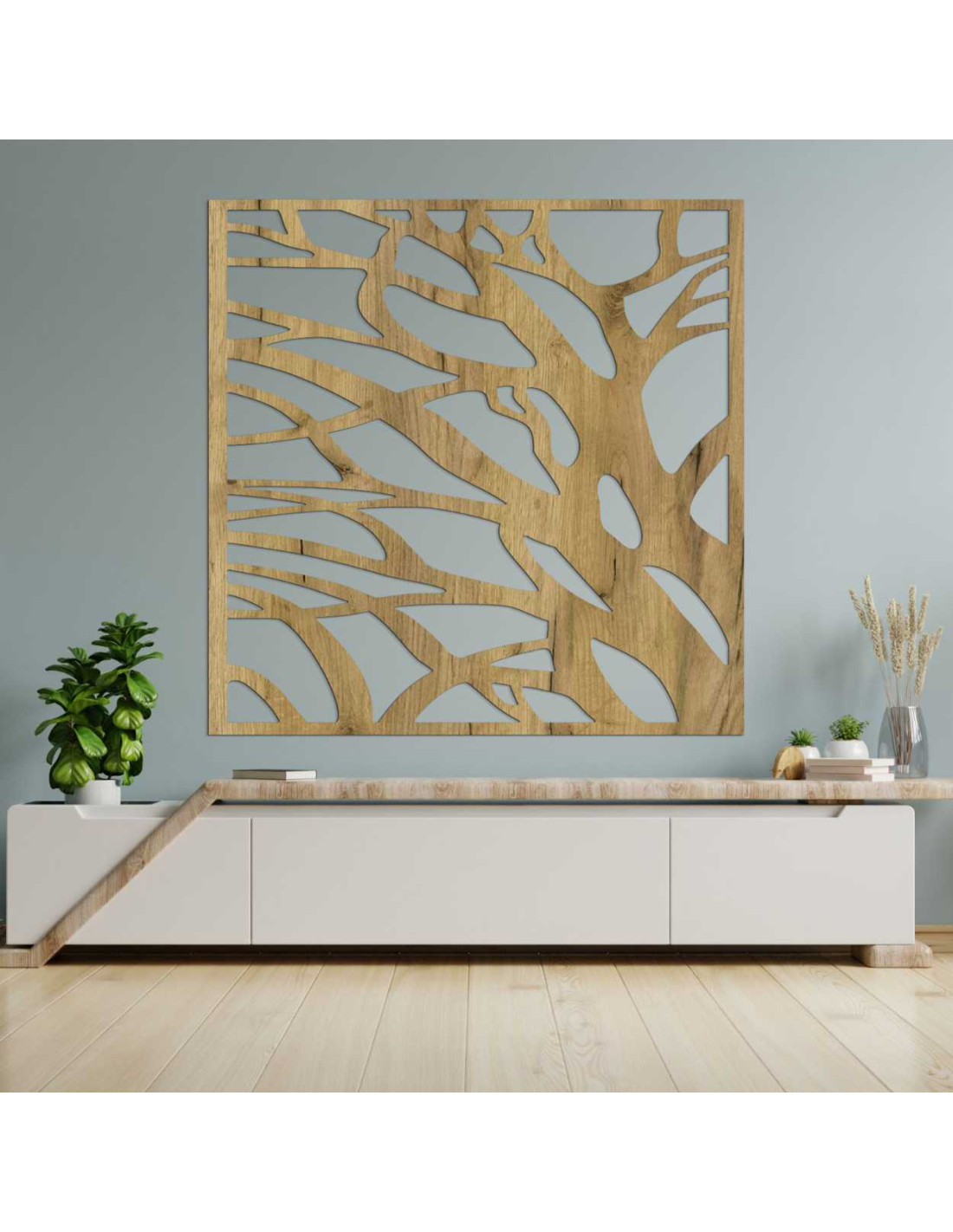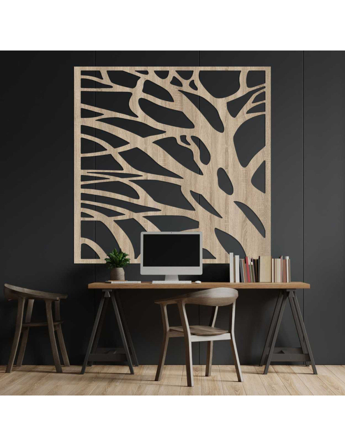 Decorațiunea modernă de perete cu un motiv de copac sculptat în lemn adaugă un farmec natural și o profunzime elegantă spațiului.