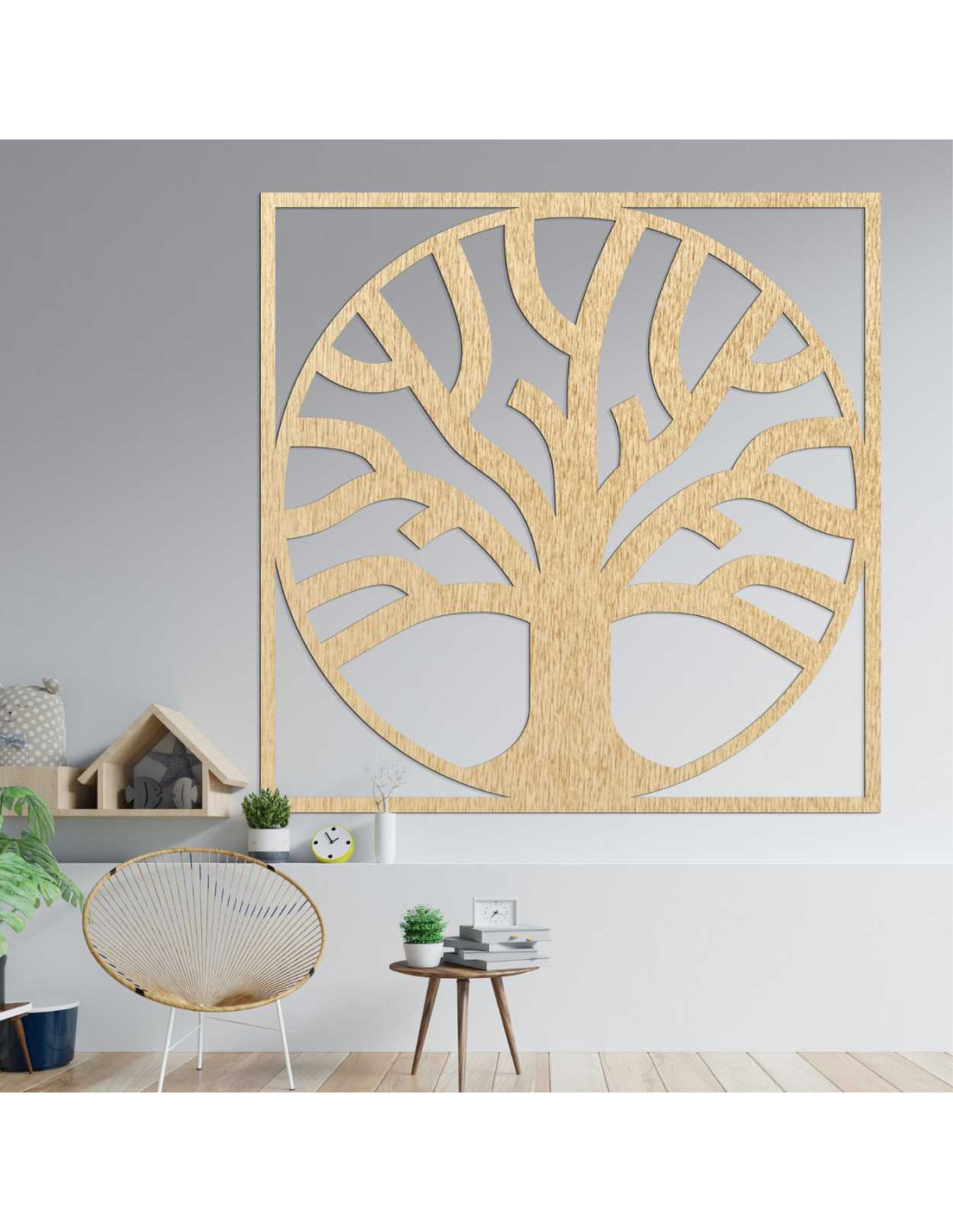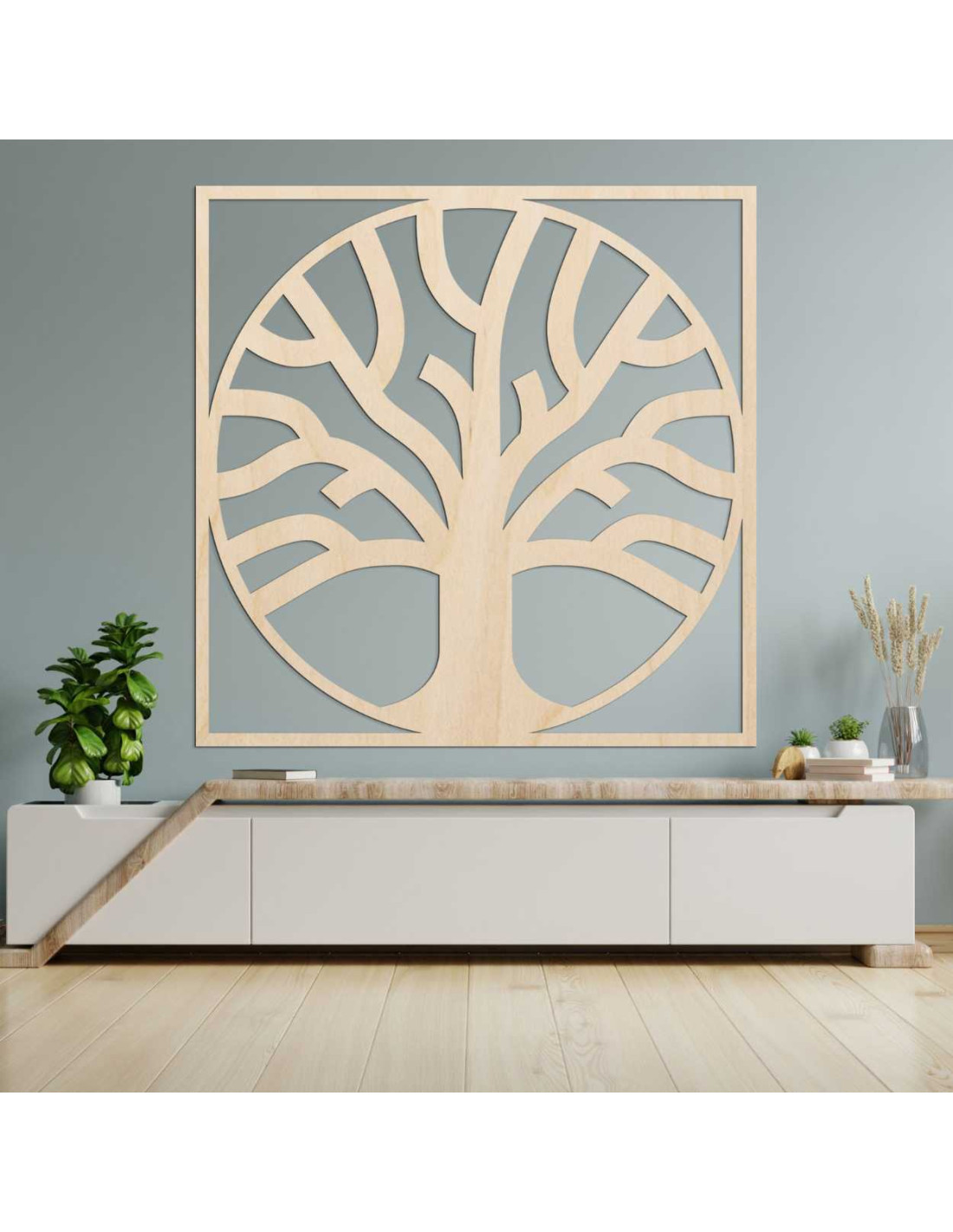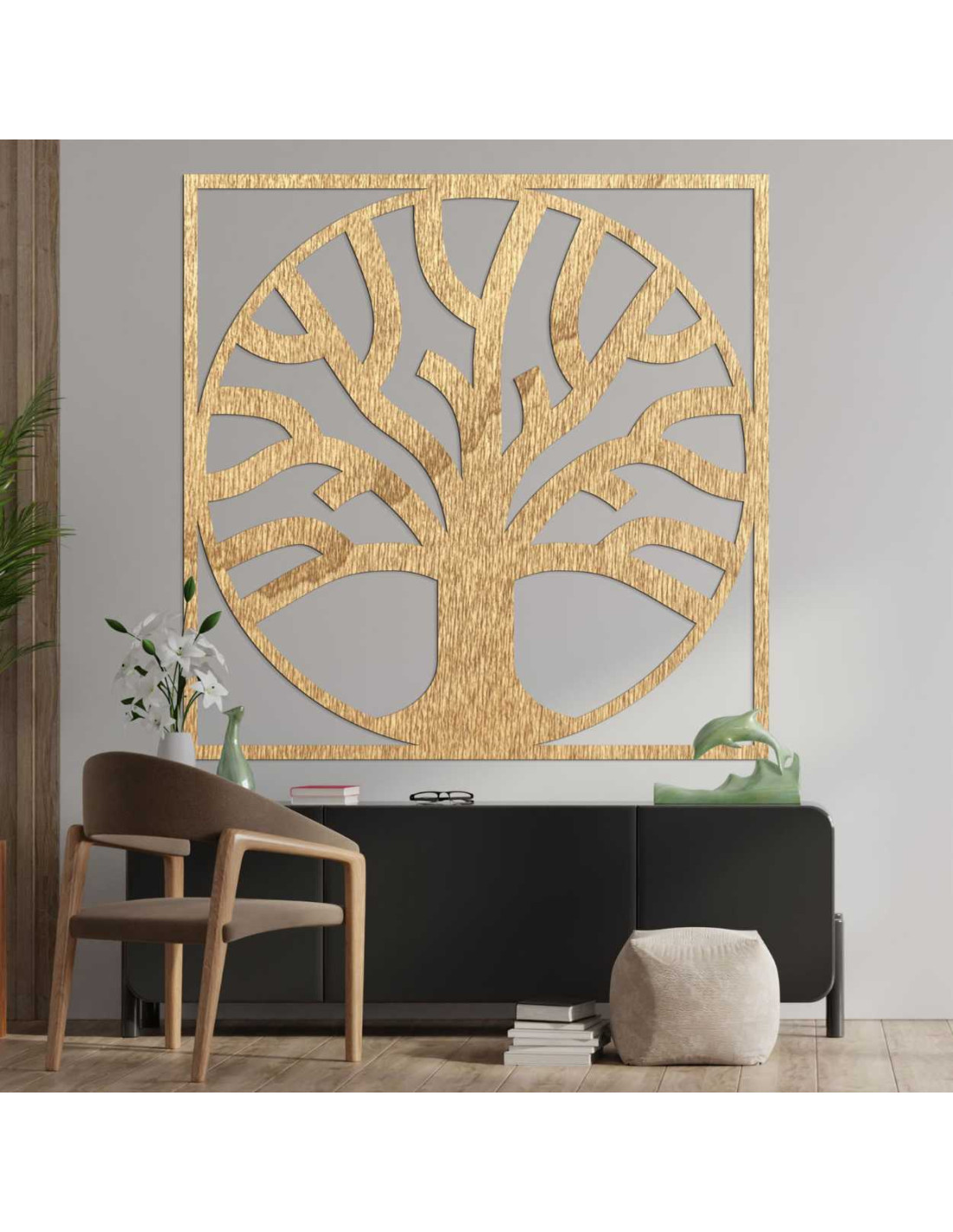 Un tablou din lemn cu un pom al vieții într-o ramă pătrată reprezintă o combinație de material natural cu o estetică minimalistă .