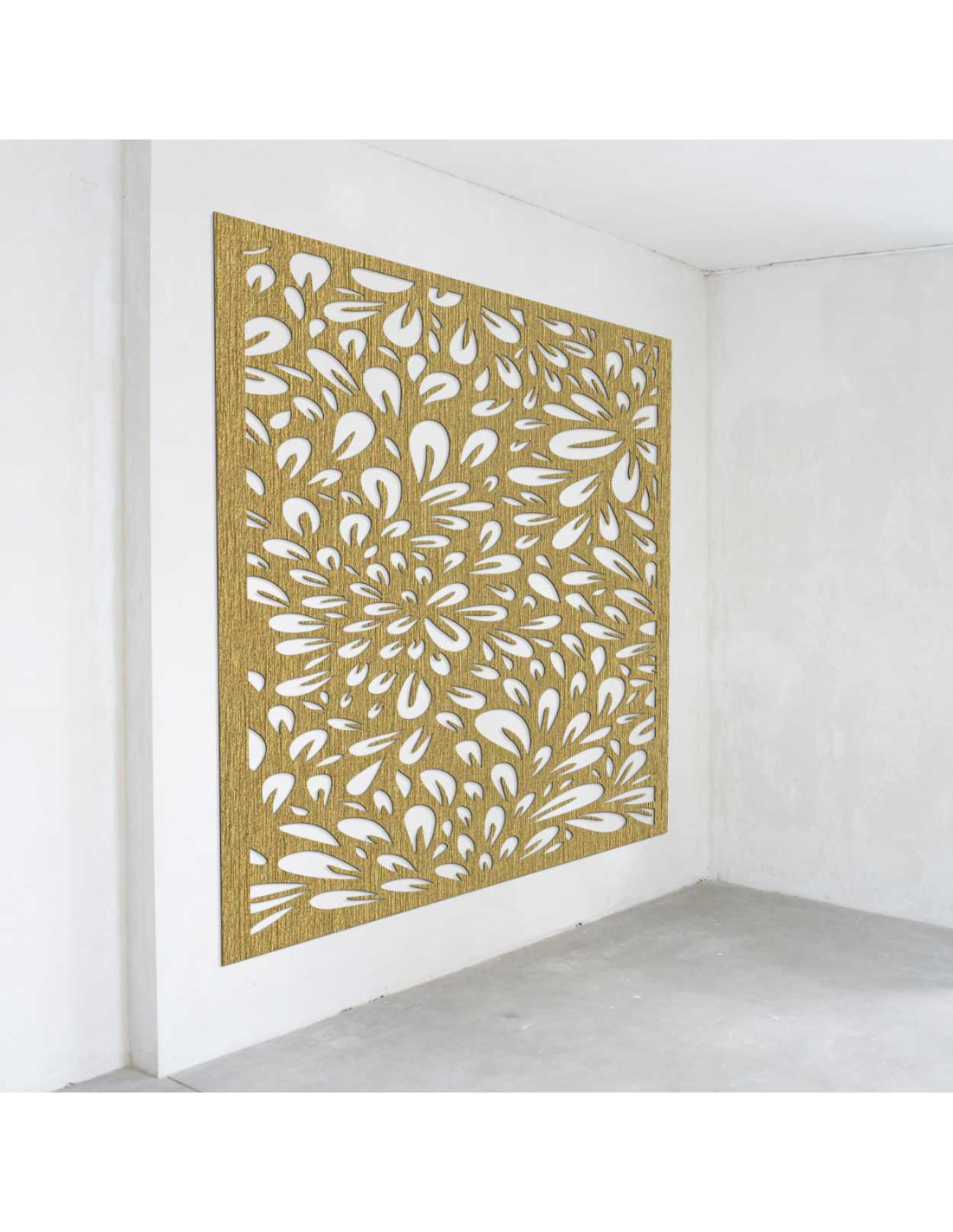 Un perete de design cu motiv laser al unei flori înflorite, realizat din lemn.
