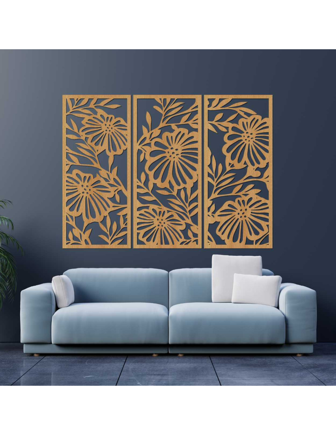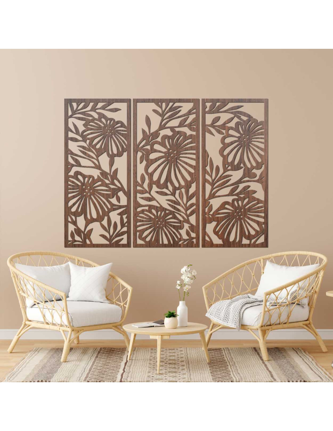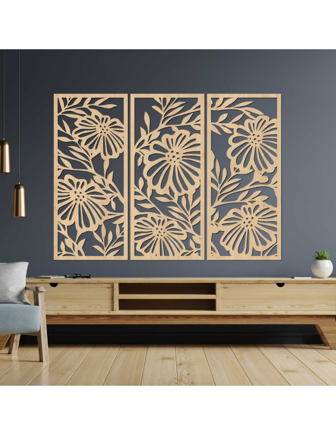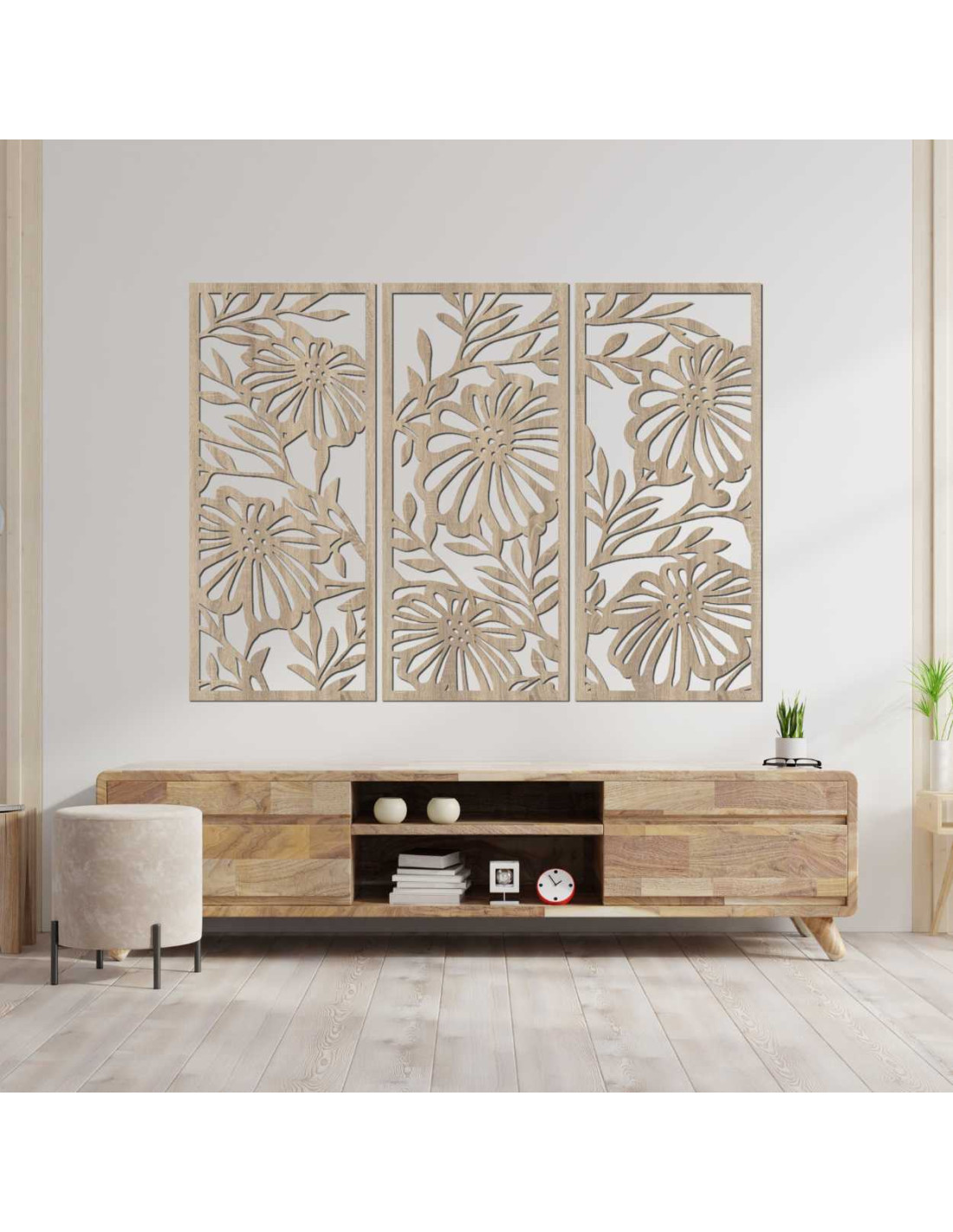 Pictura murală din lemn cu model floral se remarcă prin prelucrarea detaliată și designul modern din trei piese.