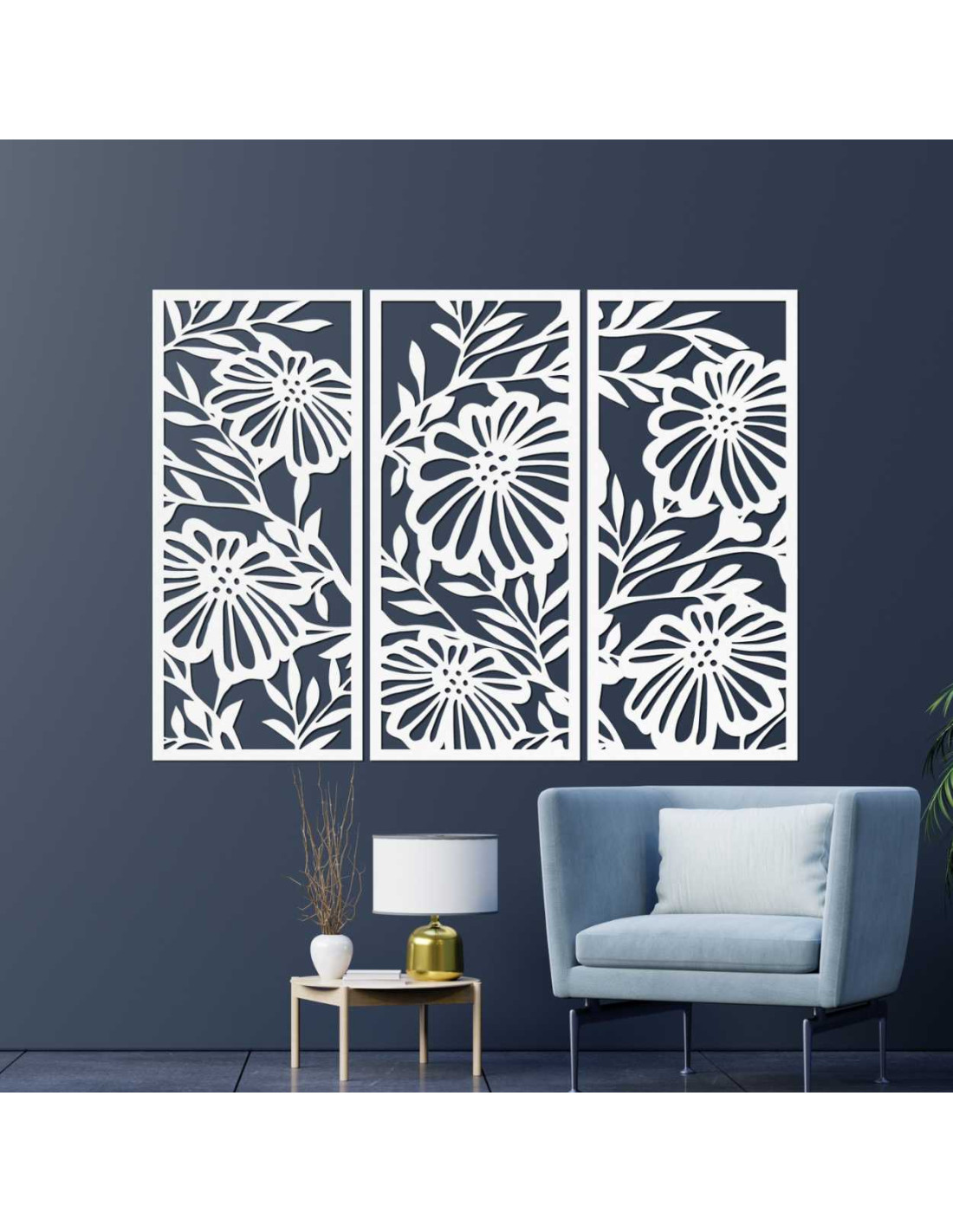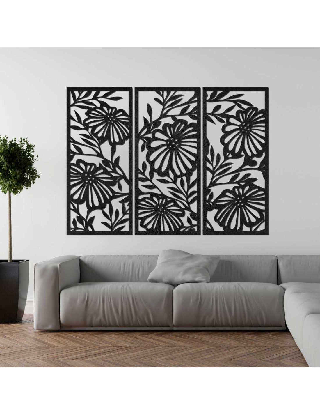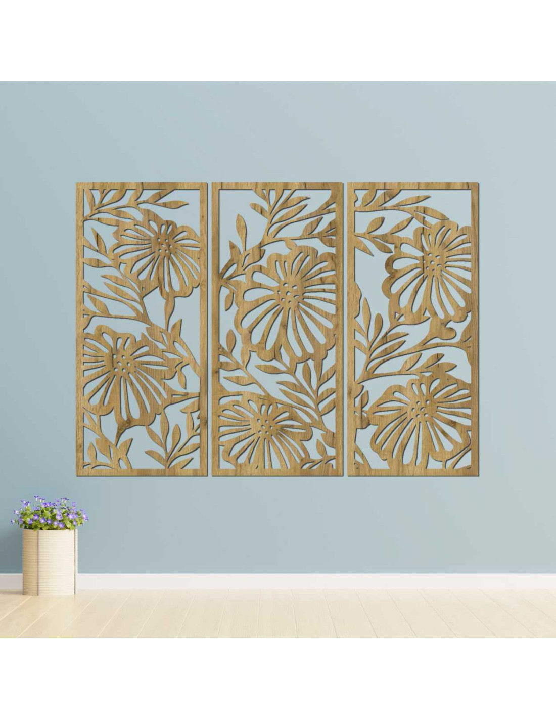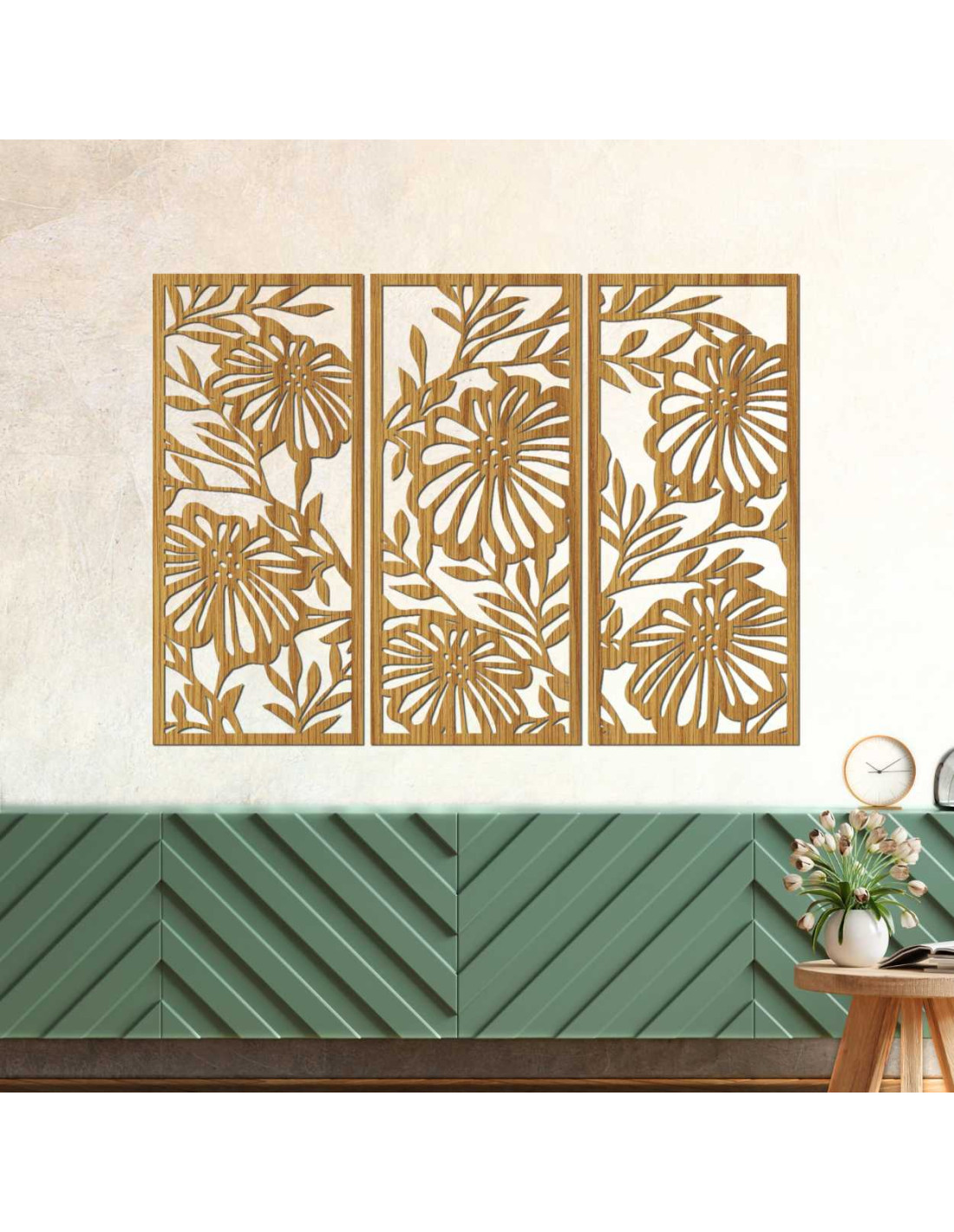 Pictura murală din lemn cu model floral se remarcă prin prelucrarea detaliată și designul modern din trei piese.