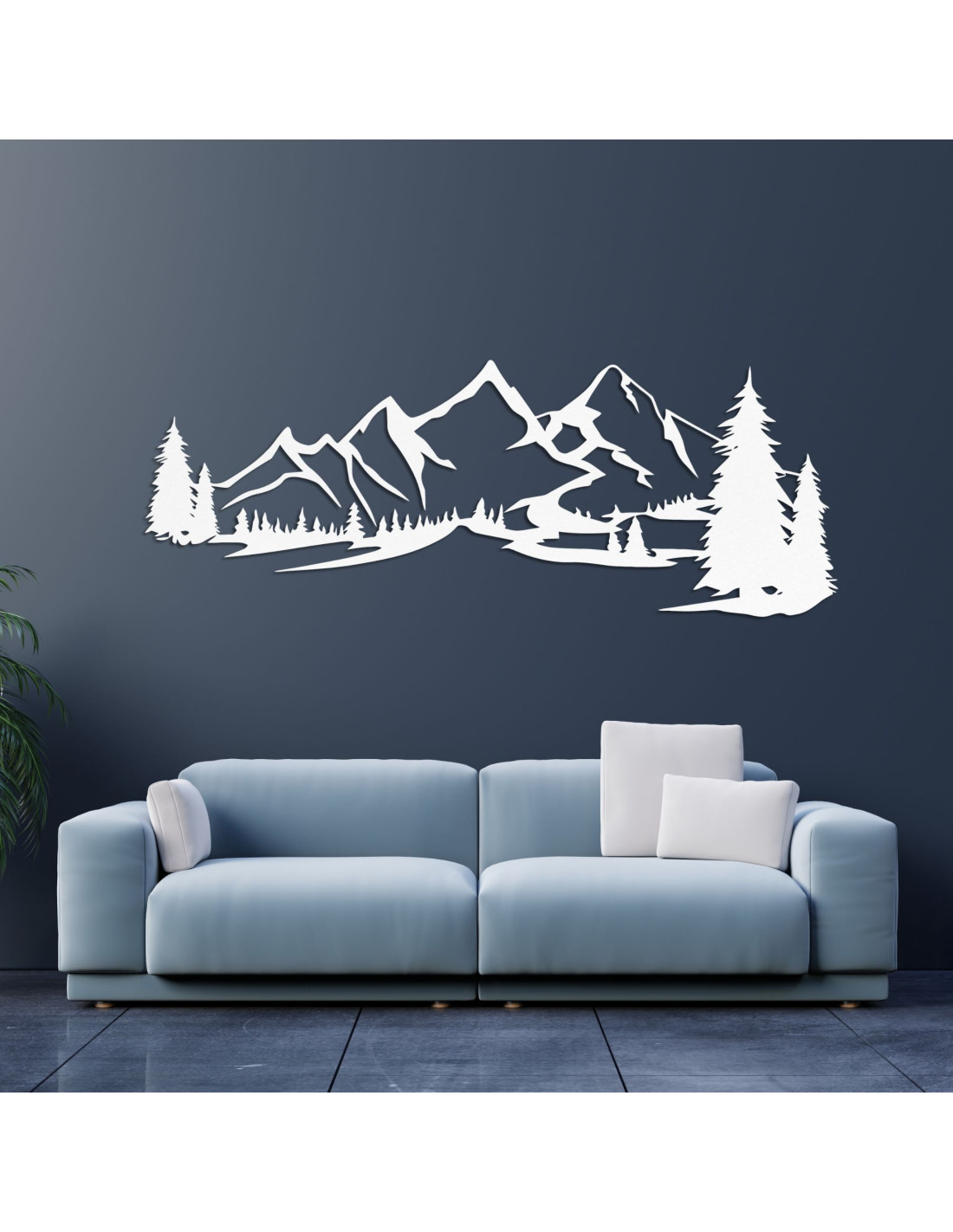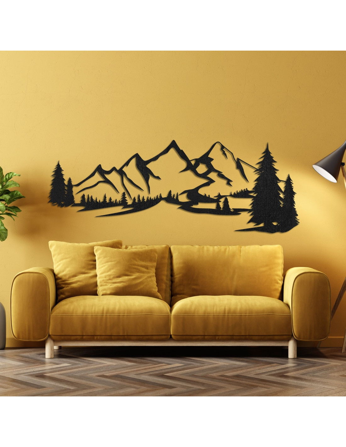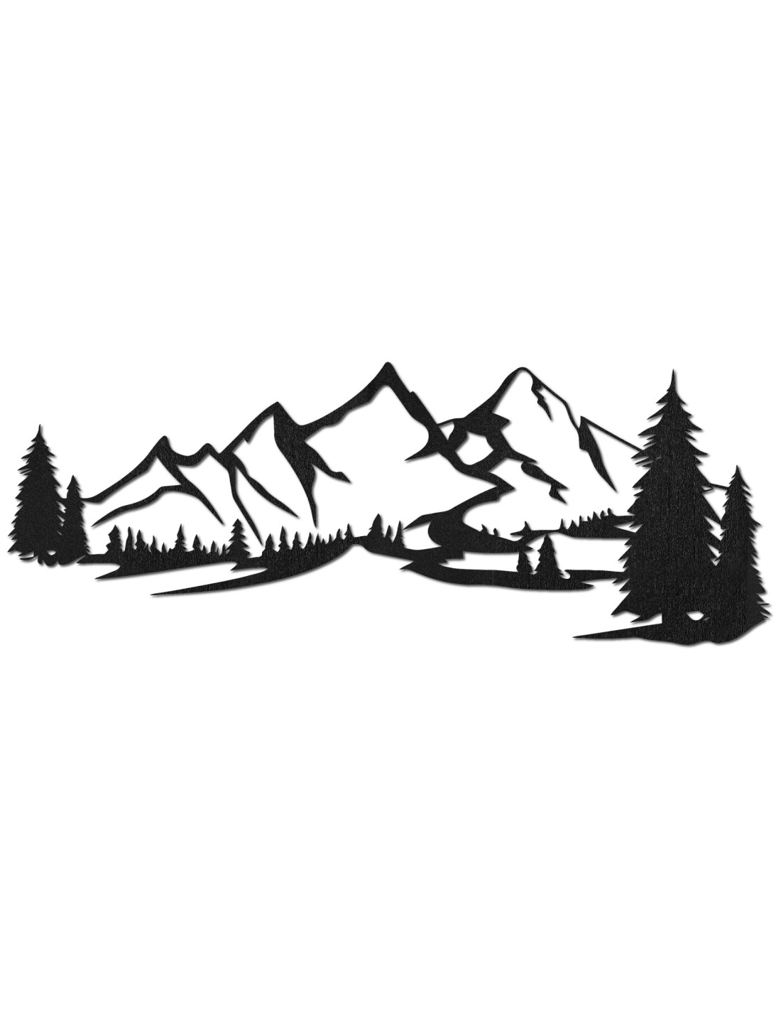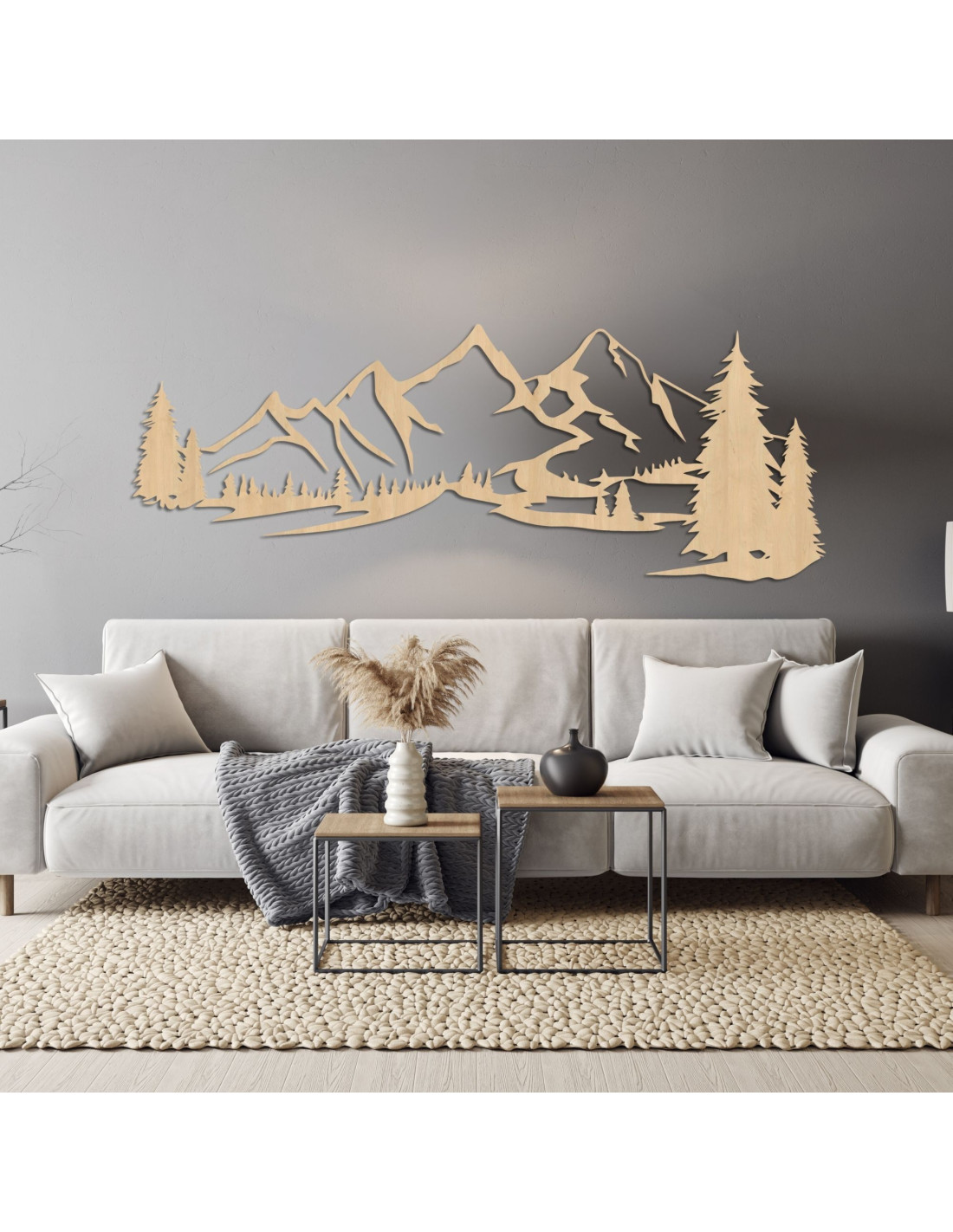 Acest peisaj montan cu conifere este creat prin tăiere cu laser pentru detalii precise și finisat cu atenție pentru a crea un efect vizual curat și distinctiv.