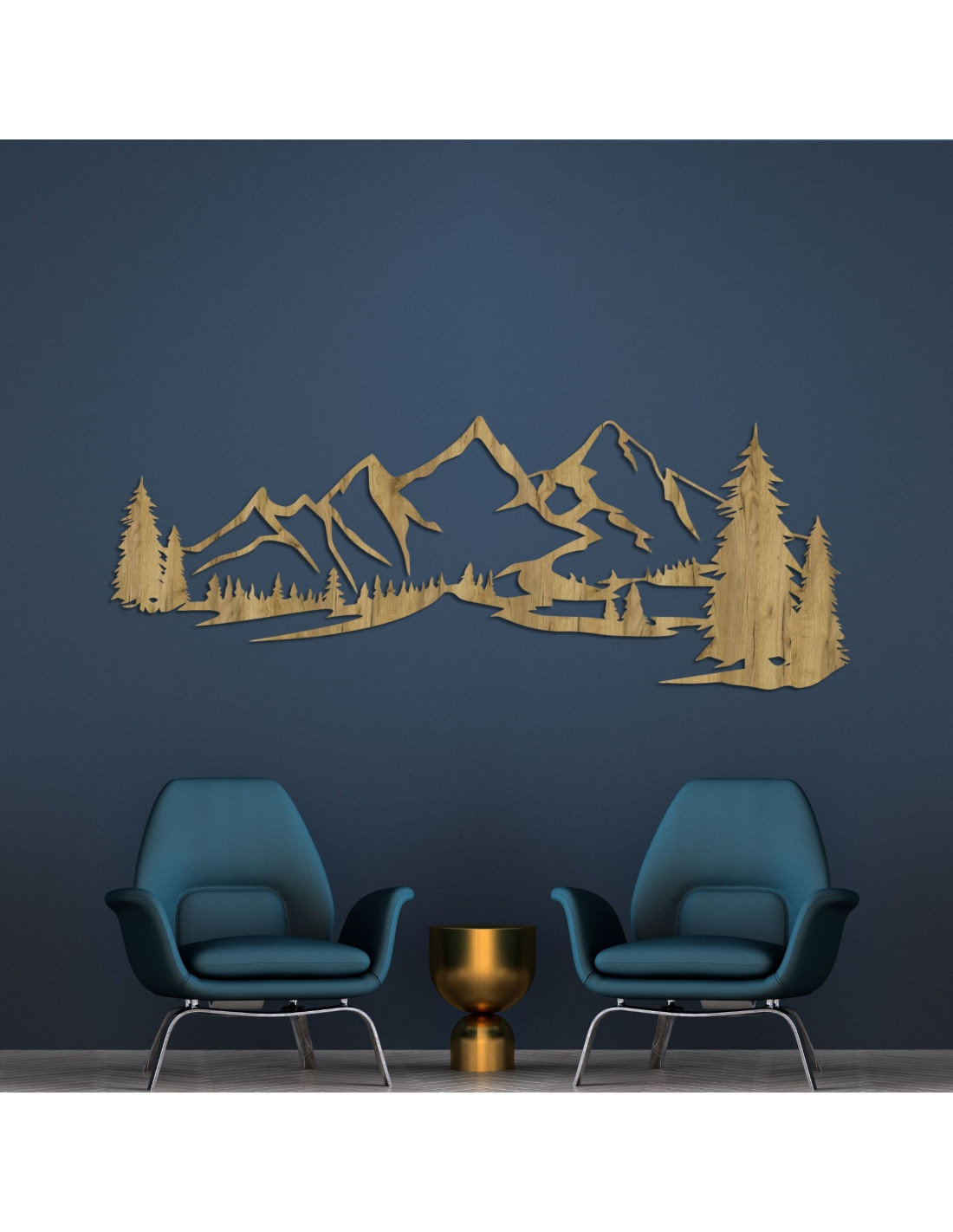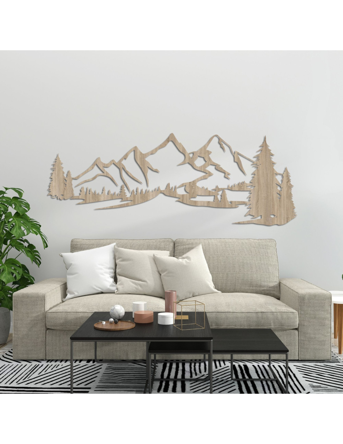 Decorațiunea murală din lemn cu motiv de peisaj montan este un accesoriu modern și elegant, care va aduce o notă liniștită de natură oricărui interior.