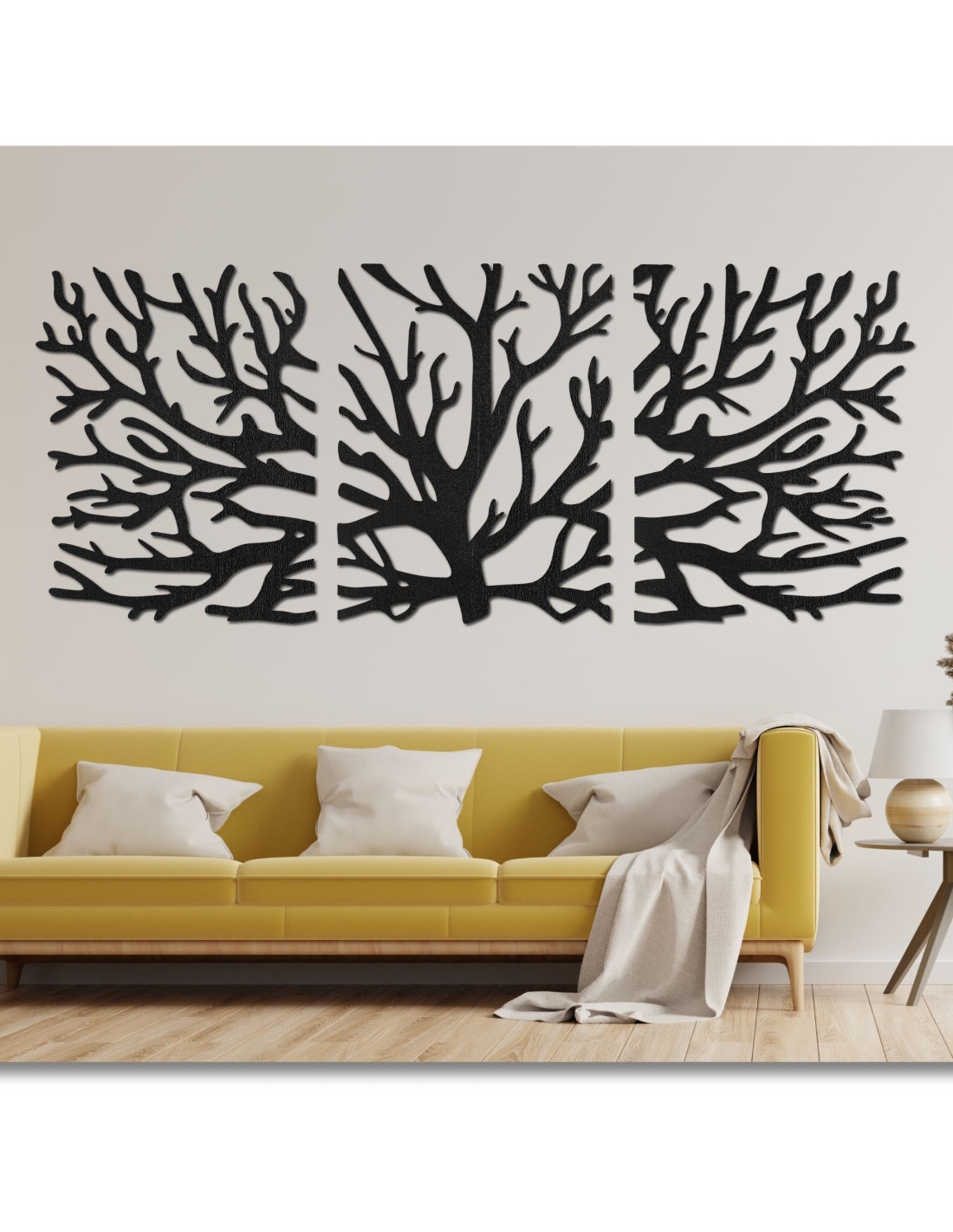 Descoperiți un tablou unic din trei piese, cu un motiv de copaci și ramuri, care combină designul modern, eleganța și atemporalitatea.