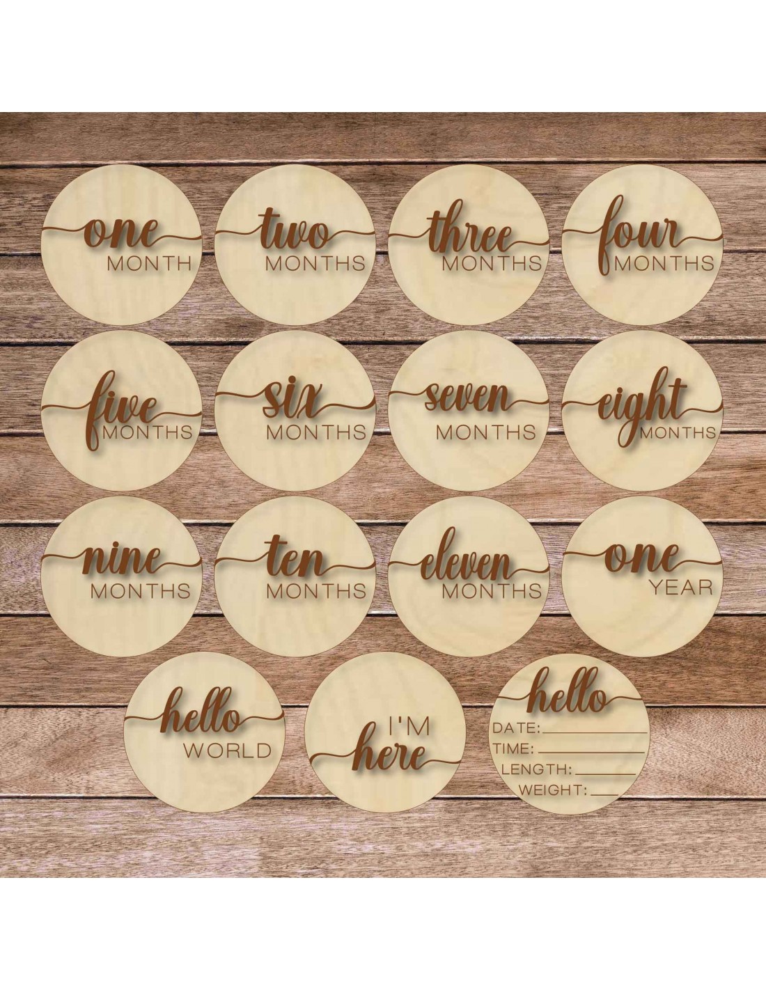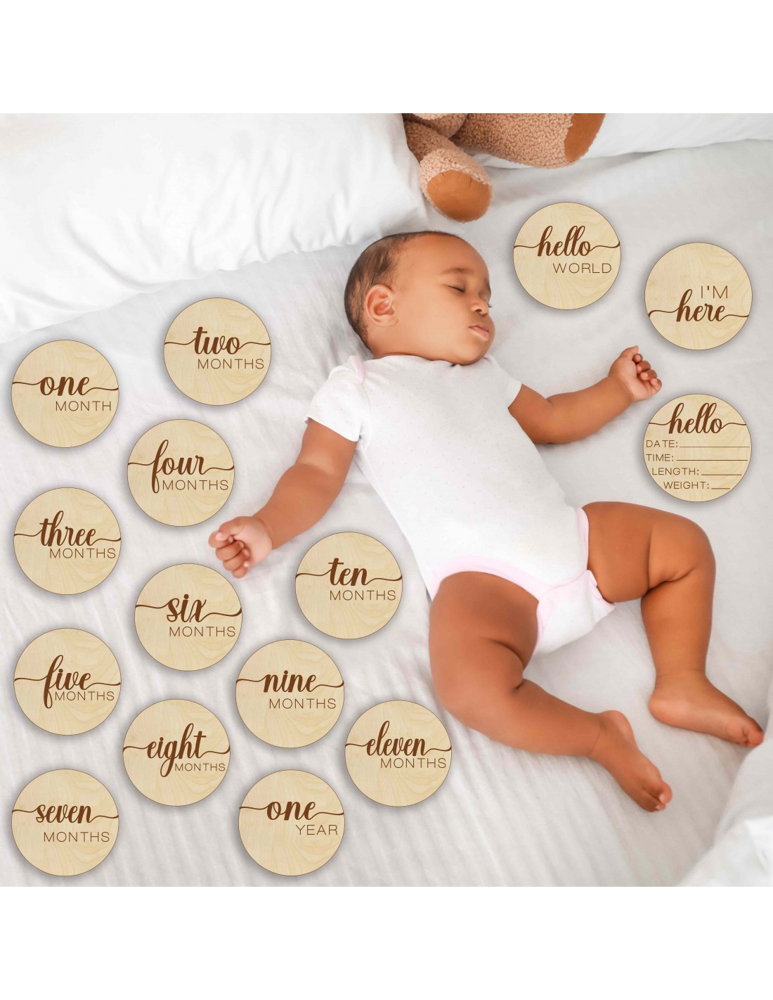 Setul include 15 diagrame din lemn (1 bucată - 10 x 10 cm) , care sunt recuzita perfectă pentru urmărirea creșterii bebelușului pe parcursul unui an.